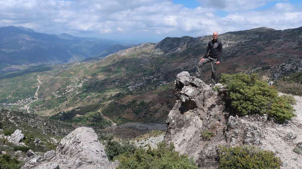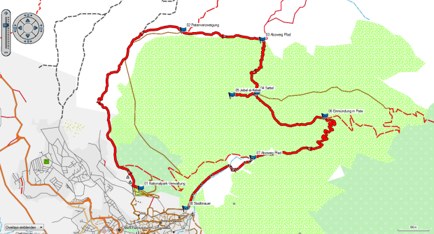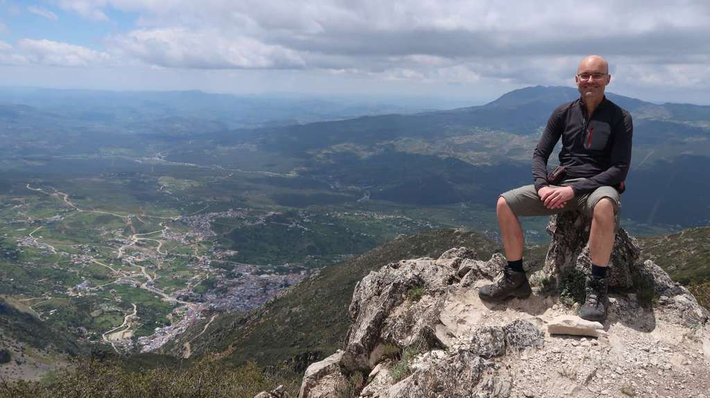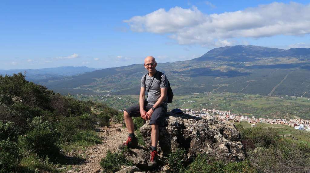 Start ist an der Nationalpark-Verwaltung (01), 700 m, oberhalb der Altstadt von Chefchaouen (hinter dem Hotel Atlas). Auf der breiten Piste am Campingplatz vorbei in den Wald. Bald auf den oberhalb der Piste verlaufenden, markierten Wanderpfad wechseln und auf diesem so lange mit schönen Aussichten über eine felsige Kuppe wandern, bis er wieder auf die Piste trifft. Dann der Hauptpiste folgen, bis rechts eine kleinere Piste abzweigt (02) und am Hang auf dieser bergauf gehen. In einem Taleinschnitt mit Linkskurve auf einen erst schwer zu sehenden Pfad (03) nach rechts abzweigen. Der steinige Pfad steigt steil in offenen Hang (einige Terrassenfelder an und mündet auf den Sattel (04) unterhalb des Jebl El Kelaa. Vom Sattel auf Pfadspuren nach rechts durch den steilen Hang aufwärts zum Gipfel (05). Vom Sattel auf zumeist deutlichem Pfad nach Süden und dann im weiten Bogen nur langsam an Höhe verlierend zur Piste nach Azilane (06). Auf der Piste dann stetig abwärts ins Tal. Am Ende einer langen, fast ebenen Geraden zweigt links ein Pfad (07) ab und überquert den Bach auf einer kleinen Staumauer. Er steigt kurz zu einer Felskuppe mit Blick auf Chefchaouen an. Dahinter steil abwärts und wieder nach rechts an einzelnen Häusern vorbei zum Bach, den man unterhalb eines Wasserfalls quert. Dann auf schönem Hangweg abwärts bis zur Stadtmauer von Chefchaouen (08).