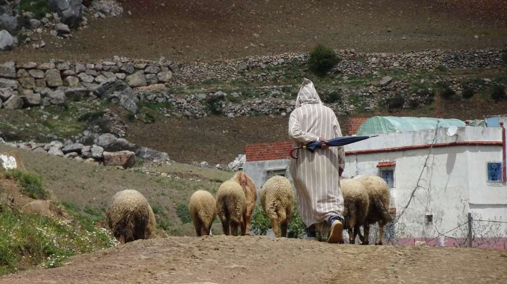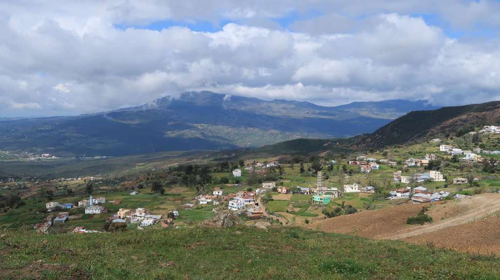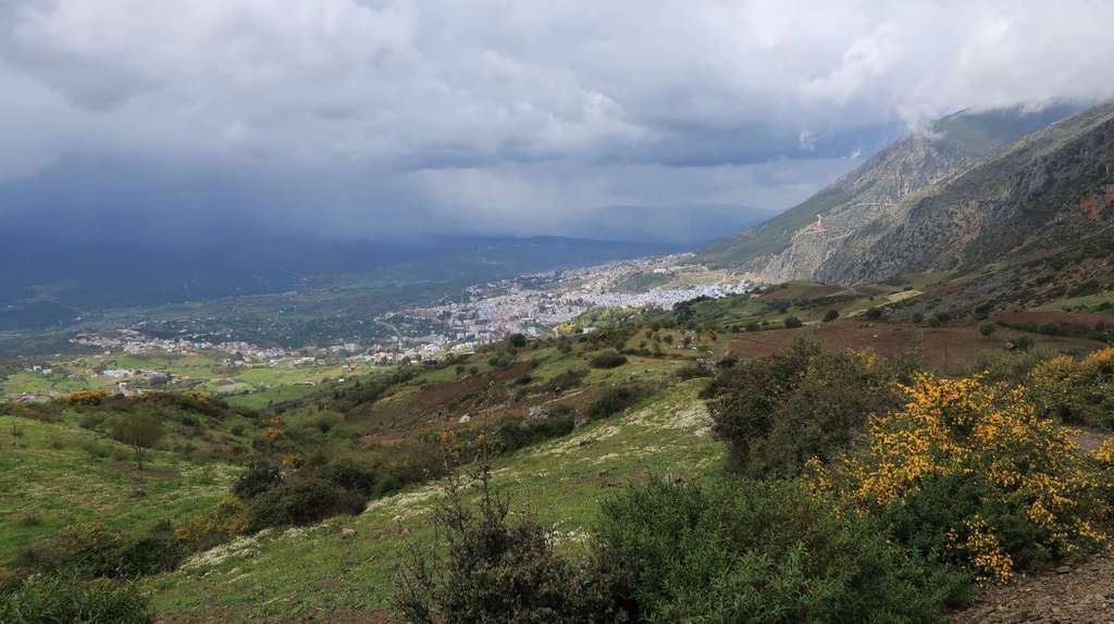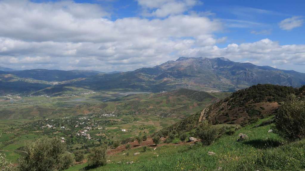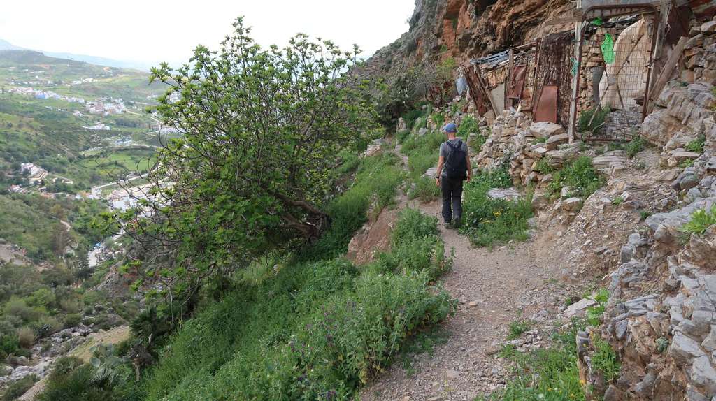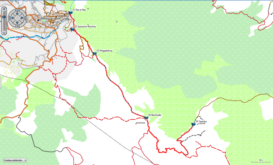 Vom Ras El Maa (Kaskaden und beliebtes Ausflugsziel am oberen Ende der Altstadt von Chefchaouen) (01) geht es auf breitem Wanderweg hinauf zur schon weithin sichtbaren spanischen Moschee (viel besuchter Aussichtpunkt) (02). Auf dem nun schmaleren Weg teilweise zwischen Bruchsteinmauern am Fuß der steilen Berghänge in südlicher Richtung. Die Route ist punktuell gelb-blau markiert. An allen Verzweigungen hält man sich geradeaus (03). Es geht durch Felder zu einer Hügelkuppe hinauf hinter der das Dorf Mechkralla auftaucht. In Mechkralla (04) trifft man an der Schule auf die Piste, die von Chefchauen heraufkommt. Dieser folgt man nun am Hang mit weiten Blicken aufsteigend im großen Linksbogen zum Dorf Tissouka (05) unter dem gleichnamigen Gipfel (2122 m). Da es auf demselben Weg zurückgeht, können wir den Umkehrpunkt nach Belieben wählen. Alternativ kann man mit einem der unregelmäßig verkehrenden Kleinbusse nach Chefchaouen zurückfahren.