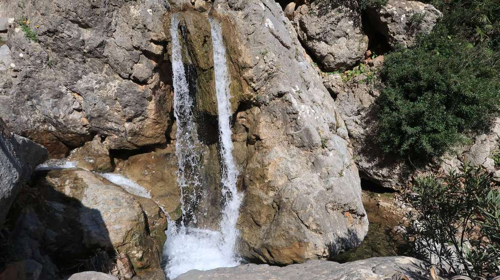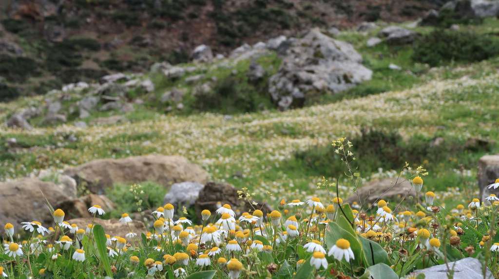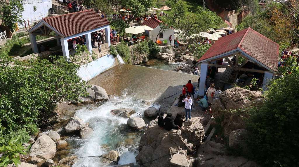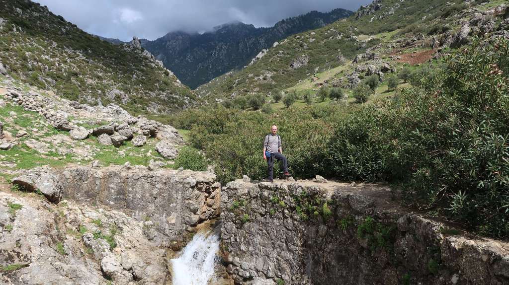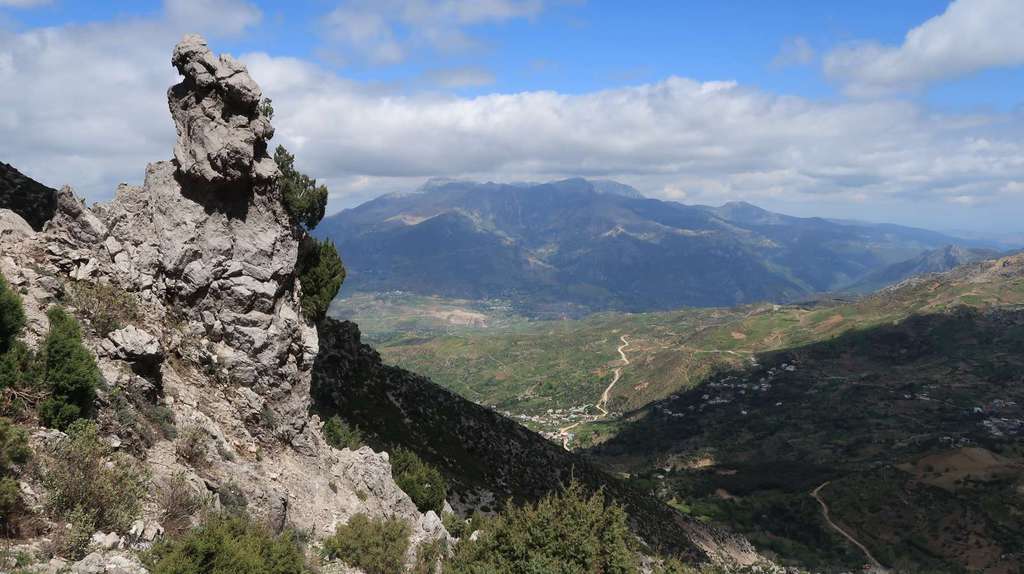 Vom Ras El Maa (Kaskaden und beliebtes Ausflugsziel am oberen Ende der Altstadt von Chefchaouen) (01) geht es auf breitem Wanderweg hinauf zur schon weithin sichtbaren spanischen Moschee (viel besuchter Aussichtpunkt) (02). Auf dem nun schmaleren Weg teilweise zwischen Bruchsteinmauern am Fuß der steilen Berghänge in südlicher Richtung. Die Route ist punktuell gelb-blau markiert. An allen Verzweigungen hält man sich geradeaus (03). Es geht durch Felder zu einer Hügelkuppe hinauf hinter der das Dorf Mechkralla auftaucht. In Mechkralla (04) trifft man an der Schule auf die Piste, die von Chefchauen heraufkommt. Dieser folgt man nun am Hang mit weiten Blicken aufsteigend im großen Linksbogen zum Dorf Tissouka (05) unter dem gleichnamigen Gipfel (2122 m). Da es auf demselben Weg zurückgeht, können wir den Umkehrpunkt nach Belieben wählen. Alternativ kann man mit einem der unregelmäßig verkehrenden Kleinbusse nach Chefchaouen zurückfahren.
