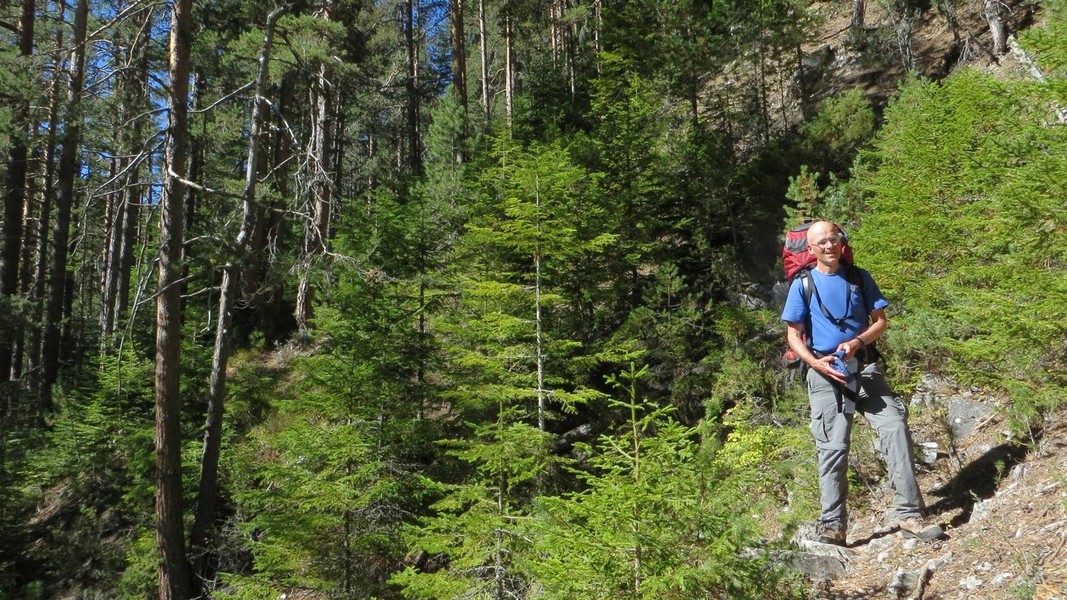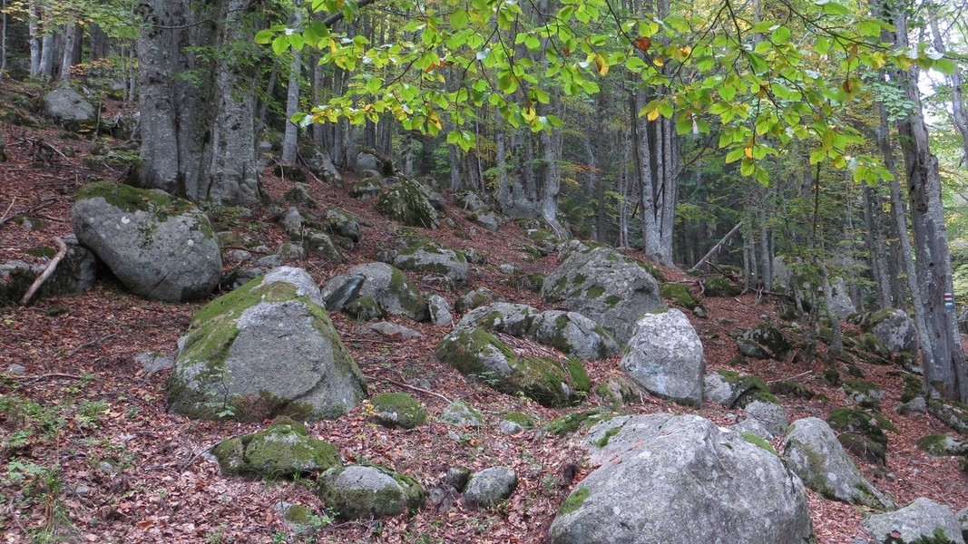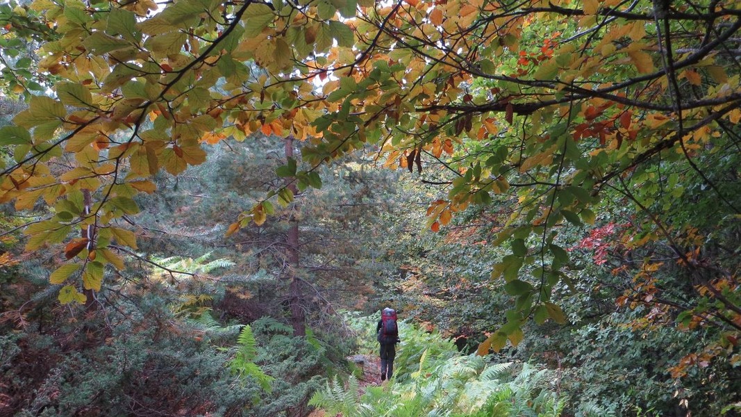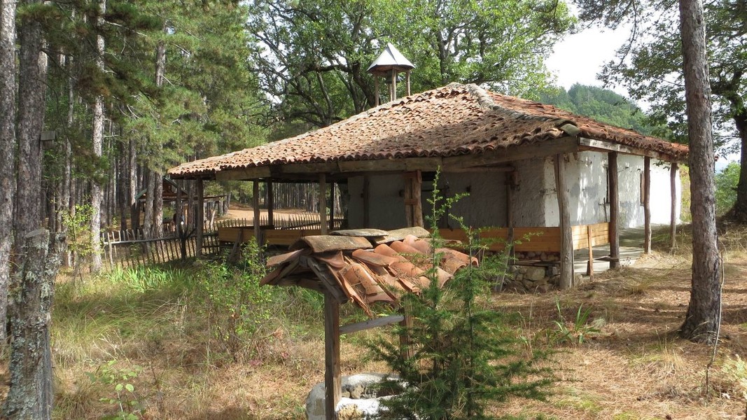 vom Sattel Goljama Poljana Abstieg Richtung Melnik auf grünem Weg bis zum Abzweig des blauen Weges zur Kapelle St. Elias; auf rotem und grünem Weg nach Roshen
