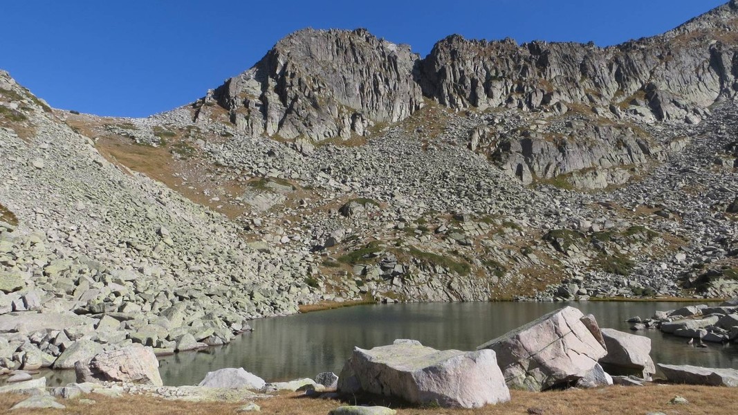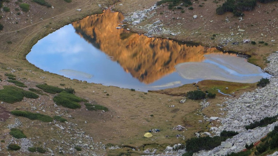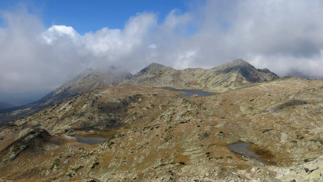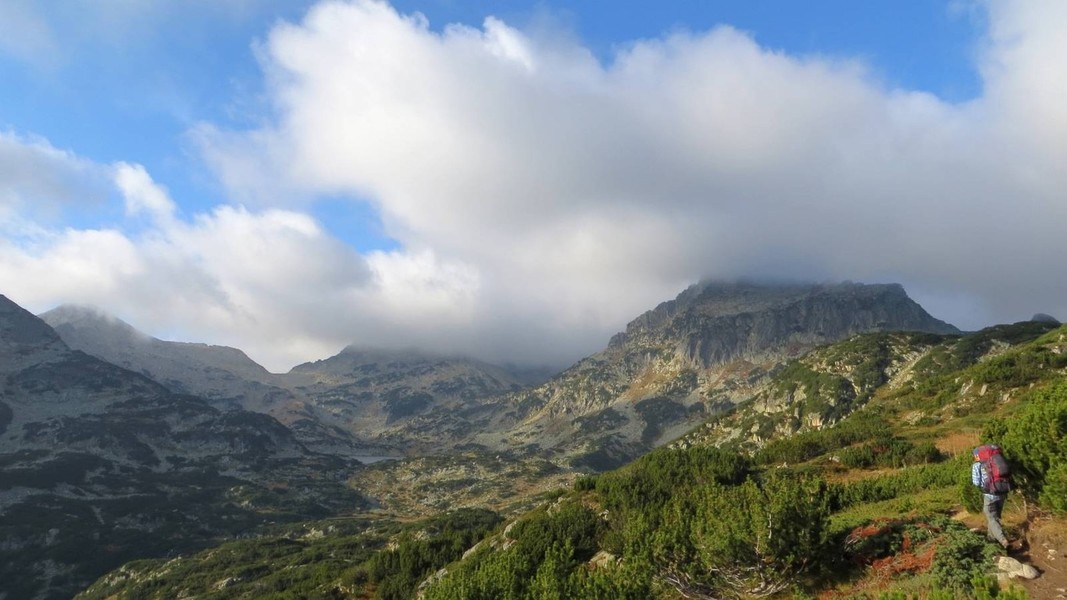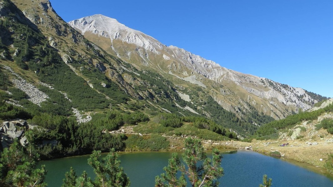von der Hütte Bezbog über Popovo Ezero zum Pass Zelezni Vrata (grüner Weg); etwas unterhalb Abstecher zum Pass Porta Smirnenski (roter Weg) und Abstieg durch das Tal Zelesniska Dolina zur Hütte Pirin (roter Weg); weiter zum Sattel Goljama Poljana (grüner Weg)