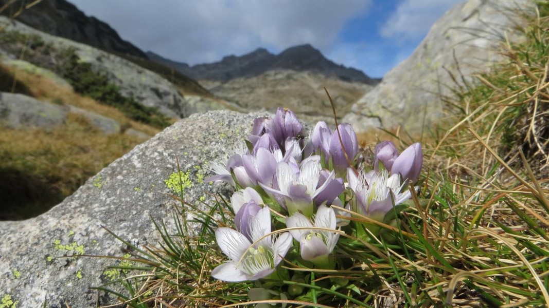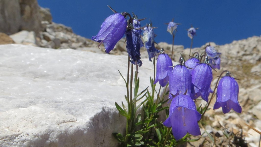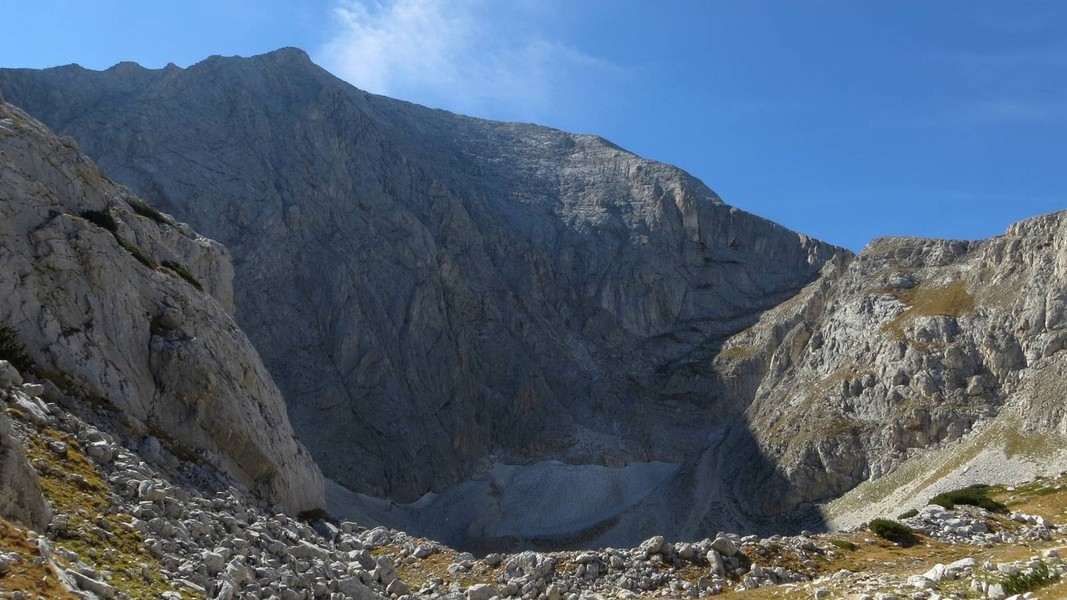 von den Prevalski Ezera kurzer Abstieg ins Tal der Valjavica (blauer Weg) und Aufstieg zur Dzanghalska Porta; weiter zur Hütte Bezbog (gelber Weg)