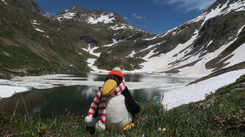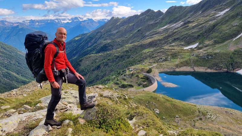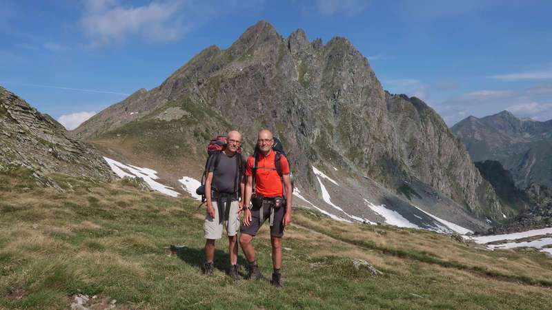 Zunächst geht es zu den jeweils eine kleine Geländestufe höher gelegenen weiteren Seen der Laghetti di Cardeto. Vom Lago Alto querren wir durch hügelige Bergwiesen oberhalb des Rifugio Baita Cardet zum Weg 233 der mäßig steil geradlinig zum Passo di Portula (2278 m) hinaufzieht. An der Passhöhe halten wir uns auf dem Weg 230 in südlicher Richtung und kommen über ausgedehnte, aber nur schwach geneigte Schneefelder an den Gipfelaufbau des Monte Madonnino. Ich folge hier ohne den großen Rucksack den vereinzelten Steinmännchen, die eine vage Wegspur durch die Steile Nordostflanke auf den 2501 m hohen, aussichtsreichen Gipfel markieren. Am höchsten Punkt treffe ich auf zahlreiche Bergwanderer, die über die wesentlich einfachere, aber in der Kompass-Karte nicht verzeichnete Südost-Route herauf gekommen sind. Ich muss auf dem Aufstiegsweg wieder zu meinem Rucksack und zu Reimar hinunter kraxeln. Der Weiterweg durch den steilen Osthang ist glücklicherweise schneefrei und so erreichen wir nach kurzem Gegenanstieg die recht viel begangene Hauptroute auf den Monte Madonnino. Auf dem Grat der Costa d‘Agnone geht es nun ohne Probleme abwärts zur teilweise sichtbaren Gruppe der Stauseen, die sich in die steilen Taleinschnitte schmiegen. Als erstes erreichen wir den Lago Cernello. Wir überqueren die Staumauer, erklimmen über bequem angelegte Stufen eine Felsstufe und kommen wenig später zum Lago Campelli Basso, den wir an seiner Südseite passieren. Über einen Höhenrücken und durch wilde Felslandschaft steuern wir zunächst das Nordende des Lago Nero und dann die Staumauer des Lago d‘Aviasco an. Wir folgen dem Weg 229 an seinem Nordufer, doch zweigen schon nach wenigen Minuten auf einen Pfad ab, der uns nach Norden zum wenige Meter höher gelegenen kleinen Lago Valrossa bringt. Schon hier gibt es Möglichkeiten zum Zelten. Wir entscheiden uns jedoch, noch ein kleines Stück weiter zu einem kleinen unbenannten See aufzusteigen, der auf seinen Wiesenflächen am Ufer einen schönen Zeltplatz bietet. Beim Aufstieg kommt man zudem zu einer gefassten Quelle mit klarem Wasser direkt am Weg.