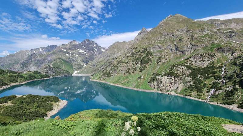 Wir kehren zurück auf den Hauptwanderweg 401 und steigen allmählich zum Wiesensattel am Monte Sponda Vaga mit seinen Liftanlagen an. Danach verliert der Sentiero Orobie Orientale etwas an Höhe und quert am Hang mit schönen Blicken hinab nach Lizzola und der dahinter aufragenden Hauptkette der Alpi Orobi zum Passo della Manina (1821 m). Nun folgt der lange Abstieg auf teilweise etwas vagem Pfad 304 durch die steilen Gras- und Buschhänge des Monte Sasna zum rauschenden Torrente Bondione, der auf einer Holzbrücke überquert wird. Dann gilt es noch einmal etwa 300 Höhenmeter zum Passo delle Miniere (1952 m) zu überwinden. Nach kurzem steilen Abstieg verläuft der Pfad am Hang entlang, wobei einige Felsriegel und Bacheinschnitte kurze Kraxeleien erfordern. Schließlich mündet unsere Route in den von Bondione heraufkommenden, deutlich breiteren Zugangsweg zum Rifugio Curò (1915 m) ein. Dieser führt nun teilweise spektakulär in die Steilwand gesprengt zum großen Stausee mit der großen Berghütte und dem zugehörigen hotelartigen Ostello. Hier genießen wir den Komfort des Zimmers mit eigenem, modernen Bad und die hervorragende Küche beim abendlichen Menu. Vorher sollte man jedoch auf kenen Fall den Spaziergang zur steilen Betonmauer des Stausees verpassen, an der regelmäßig Steinböcke artistisch weit emporklettern, um austretendes Salz abzulecken.