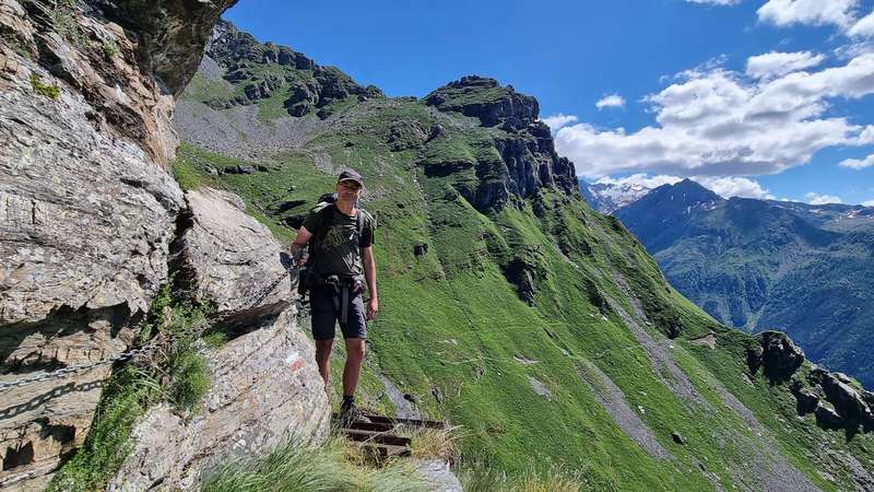 Vor dem Abstieg nach Carona lockt mich noch die Besteigung des Pizzo del Becco mit seiner nicht besonders langen und für Geübte gut zu bewältigenden Klettersteigpassage. Wir kehren zur Staumauer des Lago Colombo zurück, an deren Nordseite der ausgeschilderte Anstieg zum Pizzo del Becco beginnt. Zunächst steigt der Pfad durch Wiesen- und Blockhänge unschwierig zum Fuß einer Felswand an. Hier begegnen wir einem zutraulichen Steinbockrudel, das Reimar bei der Wartezeit Gesellschaft leistet, da er auf die Klettertour verzichtet. An einer soliden Kettensicherung erklimme ich eine Felsstufe durch einen kaminartigen Einschnitt. Auch danach leitn mich noch Sicherungen durch den steile Hang. Am Sattel angekommen wird das Fortkommen leichter und nur auf den letzten Metern zum großen Gipfelkreuz des Pizzo del Becco (2506 m) muss ich noch einmal die Hände zu Hilfe nehmen, bevor ich den Ausblick genießen kann. Auf demselben Weg kehre ich zu Reimar und den Steinböcken zurück. Von der Staumauer des Lago Colombo wandern wir auf dem Weg 250 talwärts zum Lago Becco, wo der Abstieg auf steilen Waldwegen nach Carona beginnt. Dabei lohnt sich ein kurzer Abstecher am Abzweig des Weges 213, der bald gut gesichert spektakulär durch einen senkrechten Felshang verläuft und dabei auch einen kurzen, stark gekrümmten Tunnel führt. Zurück auf dem Weg 211 setzen wir den ermüdenden Abstieg fort, bis wir den See von Carona erreichen, über dessen Staumauer wir in das beschauliche Ortszentrum gelangen. Da das Albergo Carone Ruhetag hat, nehmen wir ein Zimmer in der Locanda dei Cantu. Die Pizza am Abend und das Frühstück am nächsten Morgen lassen keine Wünsche offen.