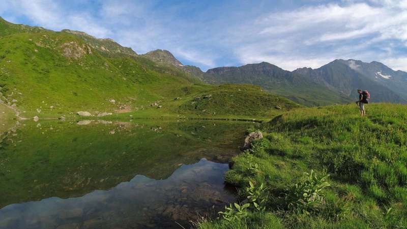 Ganz in der Nähe unseres Zeltplatzes verläuft der viel begangene Aufstiegsweg 227 zum Rifugio Brunone. Auf diesem wandern wir ohne Schwierigkeiten talwärts, lediglich an kurzen gut gesicherten Felspassagen ist etwas Vorsicht erforderlich. Auf einer Brücke wechseln wir an das Westufer des Fiume Nero und erreichen auf einem Forstweg den Weiler Fiumenero und die Straße im Tal des Serio. Wir gehen auf der Straße einen knappen Kilometer bergab und kommen in den Ort Gromo San Martino. In der Bar Trota stärken wir uns mit leckeren Panini. Nach einigen weiteren Minuten auf der Straße zweigen wir rechts ab und steigen vorbei an einigen Wohn- und alten Bauernhäusern zum Waldrand an. Auf dem steilen, aber zügig zu gehenden Waldweg 261 steigen wir nahezu 1000 Höhenmeter zu den Wiesenplateaus hinauf, in denen die idyllischen Laghetti di Cardetto liegen. Am Lago Basso schlagen wir das Zelt auf, nachdem die letzten Tagesbesucher ins Tal aufgebrochen sind.