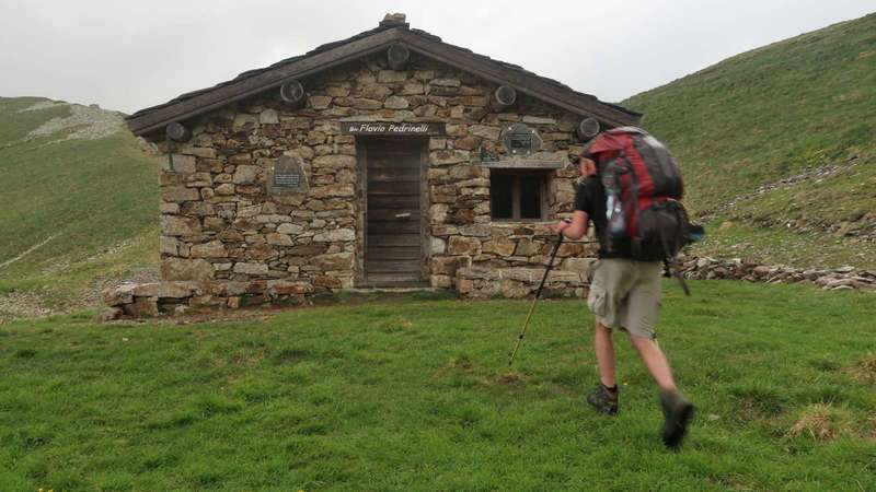 Nachdem wir in einem der beiden kleinen, aber gut sortierten Lebensmittelläden an der Hauptstraße von Carona unseren Proviant für die letzten Tage aufgefüllt haben, verlassen wir den Ort auf dem Fahrweg, der vorbei am alten Wasserkraftwerk und dem Botanischen Garten talaufwärts führt und bald in die Straße in Richtung Rifugio Fratelli Calvi mündet. Durch den malerischen Weiler Pagliari kommen wir zum Wasserfall der Cascata della Val Sambuzza. Wenig später verlassen wir die Straße vor einer Rechtskurve un zweichen auf den Waldweg ab, der links in angenehmer Steigung den Hang hinaufführt. Wir queren wenig später eine große Wiesenlichtung, kommen zu alten Steinhäusern und erreichen schließlich an der Alm Baitone di Valle Sambuzza den am Hang entlangführenden Sentiero delle Orobie occidentali, dem wir leicht amnsteigend nach Norden folgen. Schon bald verlassen wir ihn erneut und biegen auf dem Weg 209 in das Valle Sambuzza ab. In stetigem Anstieg geht es das idyllische Hochtal hinauf. Auf einer Brücke queren wir den Auslauf des Lago di Valle Sambuzza, überwinden auf dem Hauptweg bleibend eine Geländestufe und erreichen nach einigen Kehren das knapp unterhalb der Passhöhe des Passo di Publino gelegene Bivacco Pedrinelli (2353 m) in dem Moment, als heftiger Regen einsetzt. Die unbewirtschaftete Biwackhütte entstand durch private Initiative aus einem verfallenen Militärgebäude. Sie bietet einen einzigen Raum mit Tisch, einfacher Kücheneinrichtung und Matratzen auf Pritschen für etwa 8 Personen.