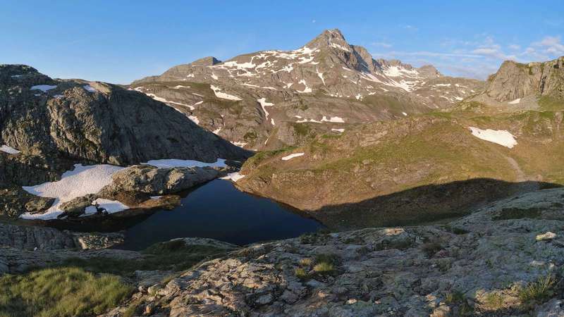 Wir folgen dem Weg 320 talwärts, halten uns an der Wegegabelung rechts und kommen bald zur wunderbar am Waldrand gelegenen Baita Bruseda (1498 m) mit fließendem Wasser (Brunnen vor dem Haus) und frei zugänglichem Vorraum, wo wir auch hätten nächtigen können. Durch Wald geht es nun weitgehend Höhe haltend auf dem Weg 311A in das Tal des Torrente Ogna. Wir queren den breiten Bach und stoßen auf den Weg 311, dem wir im grasigen Südhang des Monte Zuccone talaufwärts folgen. Gegenüber erheben sich die eindrucksvollen Nordwände der Presolana. Kurz vor der Passhöhe halten wir uns links zur Cima Verde, in deren Nähe wir auf den Sentiero Orobie Orientali (401) treffen. Wir folgen dem Kammweg mit weiten Blicken in nördlicher Richtung vorbei an der Bergstation der Skilifte an der Cima Clanca und dem Chalet del Aquila (bewirtschaftet nur im Winter). Dann erhebt sich vor uns der Felsgipfel des Monte Ferrante (2427 m), den wir an seiner Ostflanke passieren. Hier halten sich bis in den Sommer steile Schneefelder, deren Umgehung oder Querung für nicht Geübte sehr unangenehm sein kann. Von hier verläuft der Pfad zunächst ohne Schwierigkeiten auf oder am breiten Bergrücken. Kurz nach dem Pizzo di Petto (2236 m) gilt es eine mit einer Kette gesicherte Steilstufe abzuklettern, bevor uns der Pfad durch den Hang hinab zum Abzweig zum Laghetto Spigorel führt. Wir wandern durch das breite Tal etwa 15 min abwärts, bis der kleine See (1822 m) in einer Bilderbuchlandschaft vor uns liegt. An seiner Südseite bauen wir unweit des Weges auf einem kleinen ebenen Wiesenstück unser Zelt auf.