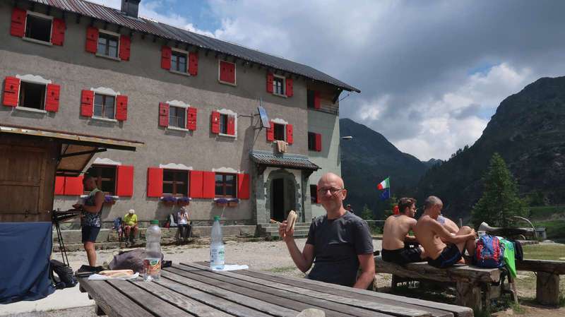 Wir kehren zum Lago d‘Aviasco zurück und folgen dem Weg 229 nach Westen: Am Ende des Sees beginnt an der Alm Baita d‘Aviasco der Anstieg zum Passo d‘Aviasco (2301 m). Danach geht es weiter in westlicher Richtung hinab in das langezogene Tal, in dem der Lago Colombo liegt. Wir Steigen zum Stausee hinab, folgen seinem Nordufer bis zur Staumauer und überqueren diese. Nun bringt uns ein sehr gut ausgebauter Weg zu den Laghi Gemelli, wo wir jenseits des Staudamms das große Rifugio Laghi Gemelli (1968 m) erreichen. Das Haus ist teilweise etwas in die Jahre gekommen und verströmt altes Hüttenflair, aber der Empfang ist freundlich und das Abendessen gut und sehr reichhaltig.