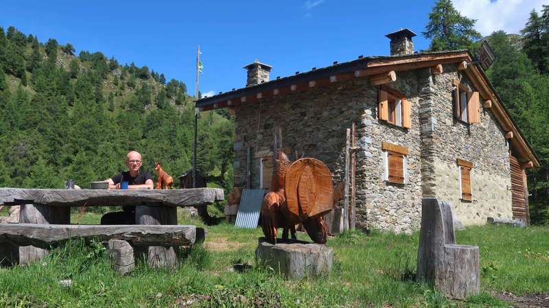 Für den Übergang auf die Nordseite des Passo di Publino muss man vom Sattel dem Pfad noch etwas nach Osten bergan folgen. Am Beginn des Abstiegs zwingen uns einige Schneefelder noch zu einem kleinen weglosen Umweg durch den Hang. Doch dann ist der Weg hinab zum Lago di Publino unproblematisch. Die Wegführung über die Staumauer ist etwas unübersichtlich, der weitere Weg dann durch offenes Gelände mit schöner Aussicht ins Valle del Livrio umso schöner. Nachdem wir einen steileren Abstieg hinter uns gebracht haben, treffen wir auf einen herrlich angenehmen Weg, der auf einer abgedeckten Wasserleitung völlig eben durch den steilen Hang verläuft. Waldpassagen, Lichtungen und schließlich auch einige enge Tunnel machen die Strecke sehr abwechslungsreich. Am Ende der Wasserleitung steigen wir kurz steil zum Lago della Casera herauf. Das dort in der Karte verzeichnete Bivacco ist verschlossen, sodass wir über einen kleinen Bergrücken noch zum Lago delle Zocche weiterwandern. Knapp unterhalb des von Gelbem Enzian umgebenen idyllischen Sees steht das Bivacco Facetti (2014 m) offen. Als einzige Übernachtungsgäste genießen wir die komfortable Selbstversorgerhütte (vollständig eingerichtete Küche, Toilette mit Wasserspülung, Schlafraum im Dachgeschoss für bis zu 20 Personn), die kunstvoll aus Holz geschnitzten Tiere und Figuren im Umfeld der Hütte und die Abendsonne auf der Sitzbank mit Blick ins Tal.