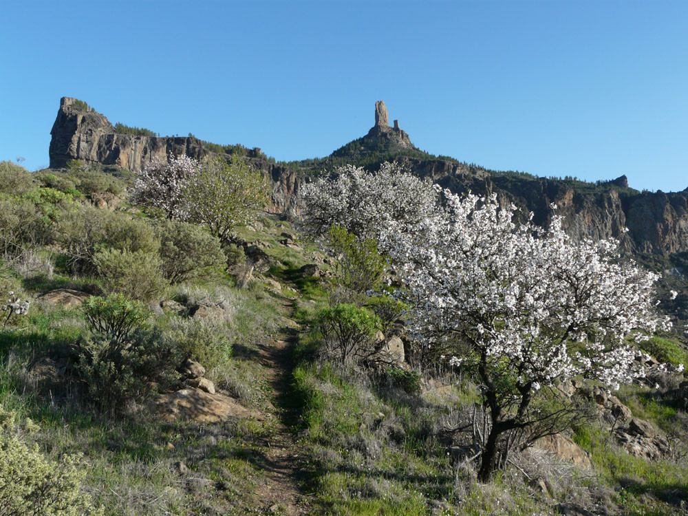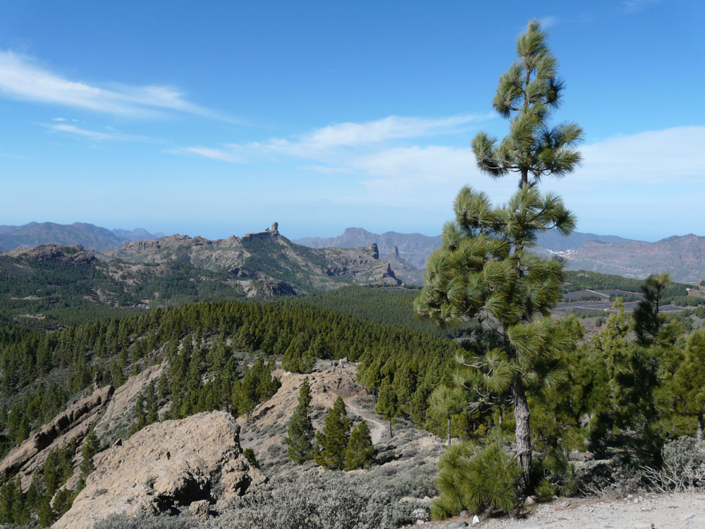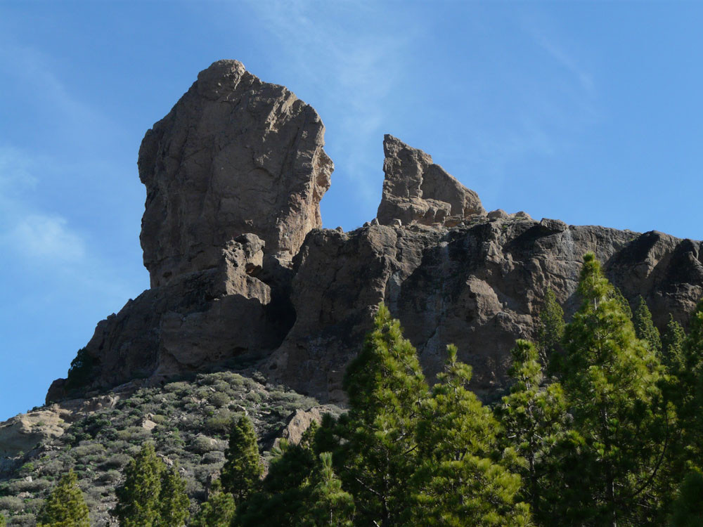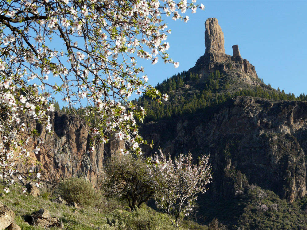 Die große Runde um den bekanntesten Felsen der Insel beginnt am Parkplatz der Degollada La Goleta. Von hier geht es auf direktem Weg zum Roque Nublo hinauf mit Ausblick auf weitere bizarre Felsgebilde. Wenn wir die Aussicht vom Roque Nublo genossen haben, gehen wir ein Stück zur Wegverzweigung am Sattel zurück und steigen nach Süden durch ein Tal zur Straße ab, die wir am der Degollada del Aservador erreichen. Ihr folgen wir nun für etwa zwei Kilometer in Richtung Tejeda. Die Blicke in die Barrancos nach Westen sind gewaltig. Am Cruz de Timagada verlassen wir die Straße und gehen den Weg geradeaus weiter. Bald zweigen wir rechts nach La Culata ab. Am Rand des kleinen Weilers steigen wir dann auf schönem Waldweg hinauf zu unserem Ausgangspunkt.