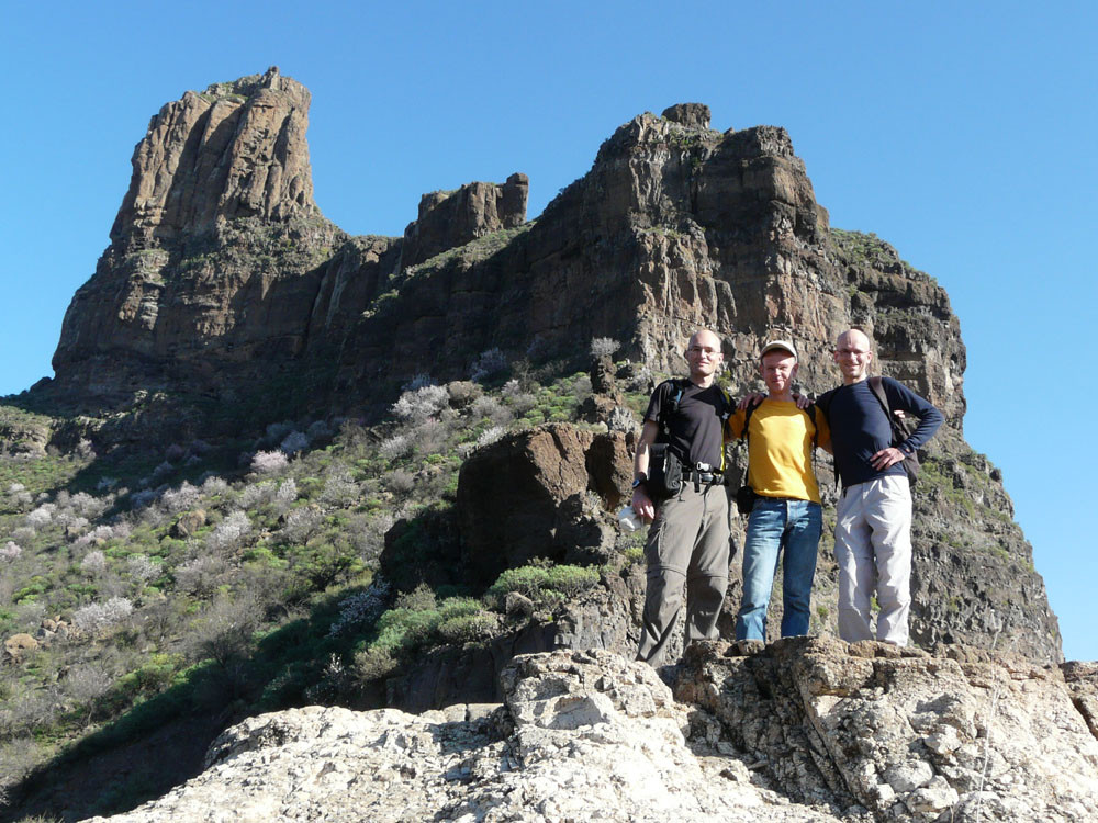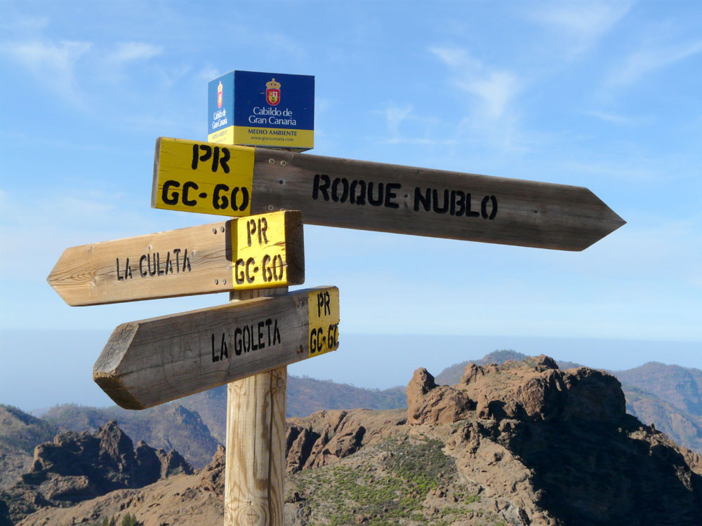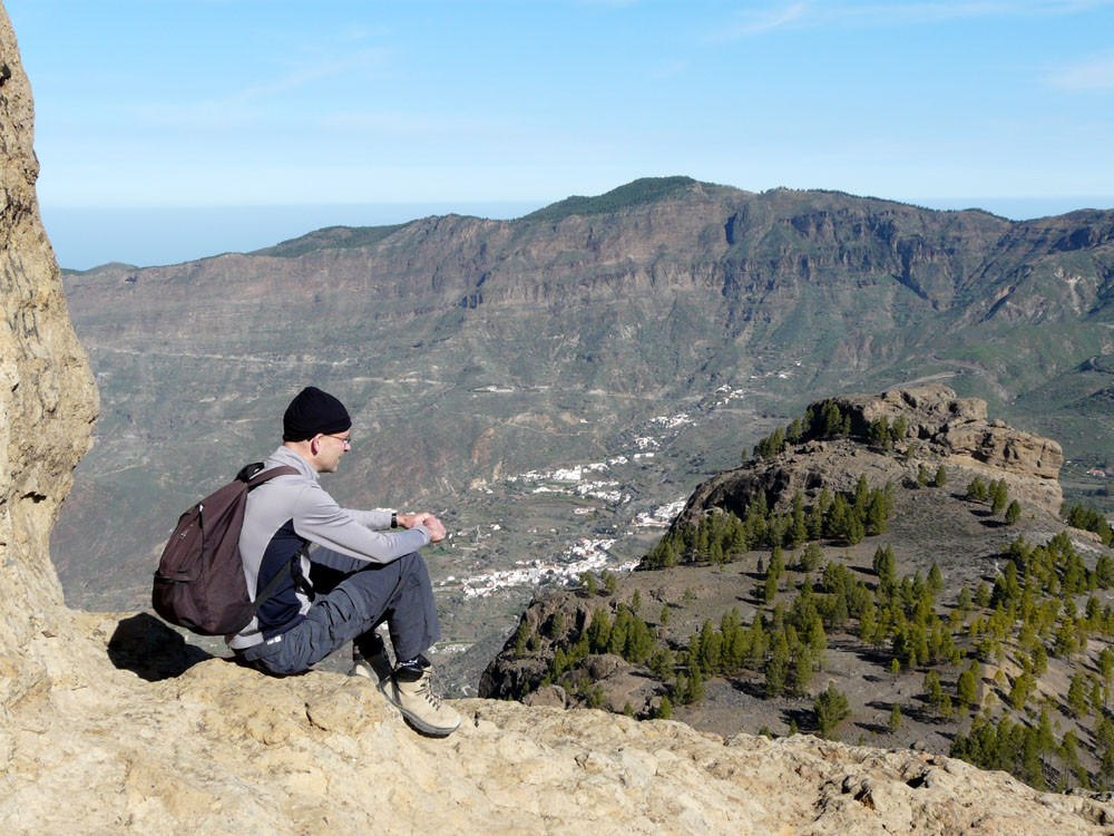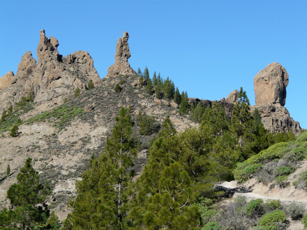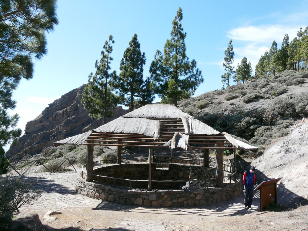 Die große Runde um den bekanntesten Felsen der Insel beginnt am Parkplatz der Degollada La Goleta. Von hier geht es auf direktem Weg zum Roque Nublo hinauf mit Ausblick auf weitere bizarre Felsgebilde. Wenn wir die Aussicht vom Roque Nublo genossen haben, gehen wir ein Stück zur Wegverzweigung am Sattel zurück und steigen nach Süden durch ein Tal zur Straße ab, die wir am der Degollada del Aservador erreichen. Ihr folgen wir nun für etwa zwei Kilometer in Richtung Tejeda. Die Blicke in die Barrancos nach Westen sind gewaltig. Am Cruz de Timagada verlassen wir die Straße und gehen den Weg geradeaus weiter. Bald zweigen wir rechts nach La Culata ab. Am Rand des kleinen Weilers steigen wir dann auf schönem Waldweg hinauf zu unserem Ausgangspunkt.