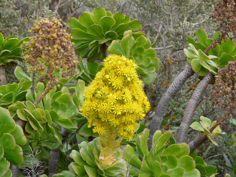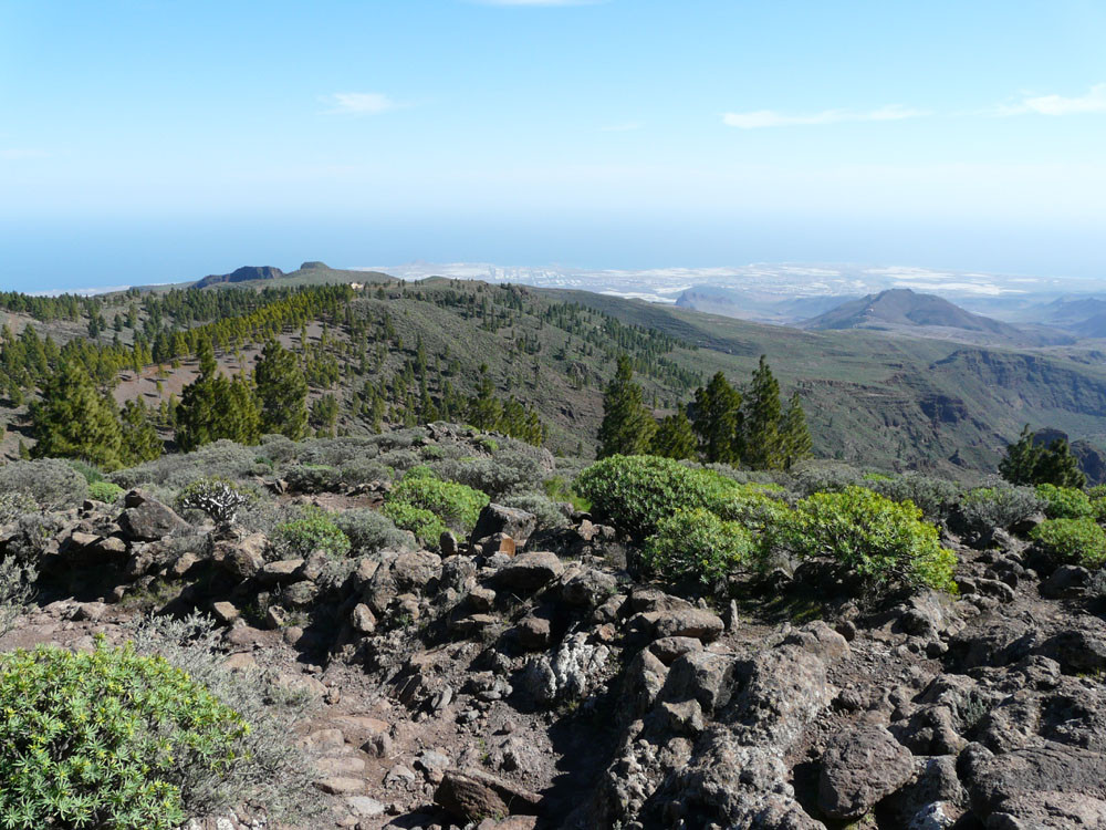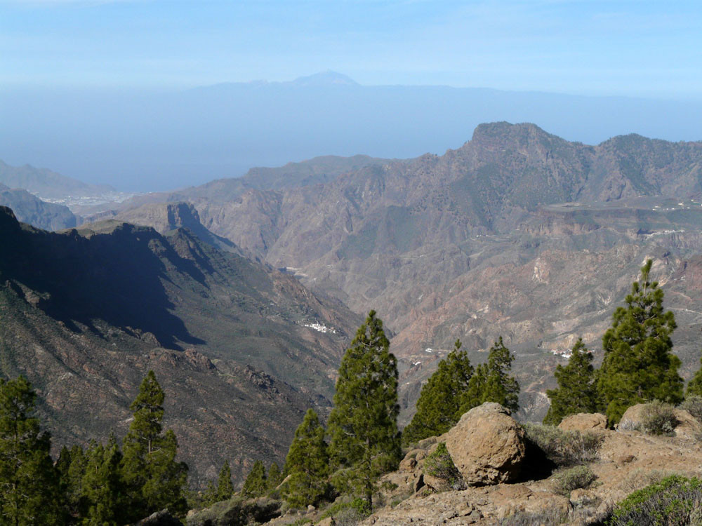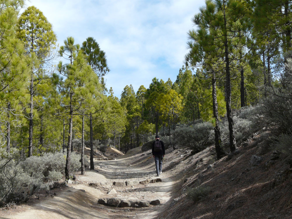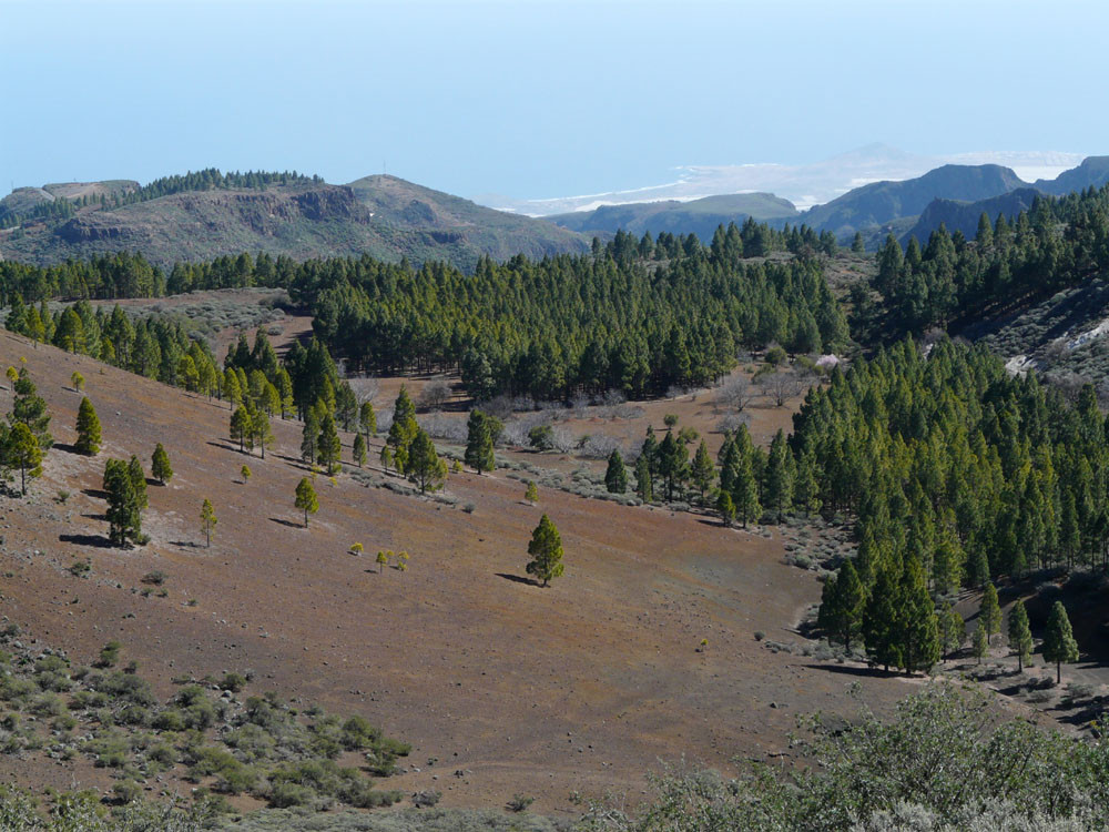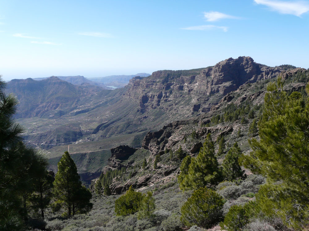 Die lange Runde über den höchsten Gipfel der Insel verlangt Ausdauer, beschert uns aber auch wunderbare Ausblicke. Wir beginnen am Cruz Grande oberhalb von San Bartolomé de Tirajana. Nach einem kurzen Stück auf einer Piste fängt bald der spektakuläre Pflasterweg durch die Felswände der Riscos de la Librería an. In vielen Kehren erreichen wir so bequem ein Plateau aus rotem Vulkangestein. Dann geht es durch Kiefernwald zur Degollada de los Hornos, wo wir rechts auf den Weg zum Pico de las Nieves einschwenken. Vom 1.949 m hohen Gipfel haben wir dann tolle Blicke über den Südteil Gran Canarias. Beim Abstieg gehen wir zunächst auf der Straße, kommen bald zu einer alten Schneegrube und folgen von hier weiter einer Straße zur Radiostation auf dem Roque Redondo. Dort gehen wir zunächst auf einer Piste und später auf kleinem Pfad in vielen Windungen weiter zum Cruz de Socorro. Von hier folgen wir dem Bergrücken nach Süden und kommen zu einem gut ausgebauten Steig, der sich nach Taidía hinabwindet. Durch das Dorf hindurch und ein Stück der Straße folgend kommen wir zu einem Weg, der uns nach San Bartolomé de Tirajana bringt. Am oberen Ortsrand nahe der Sportanlagen stoßen wir auf den Weg, der zurück zum Cruz Grande führt.