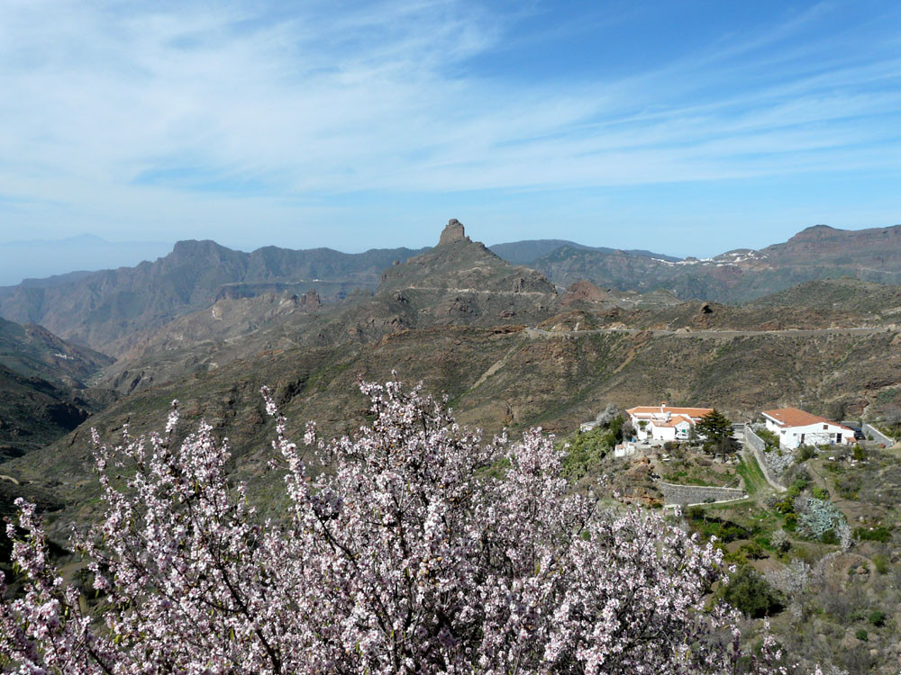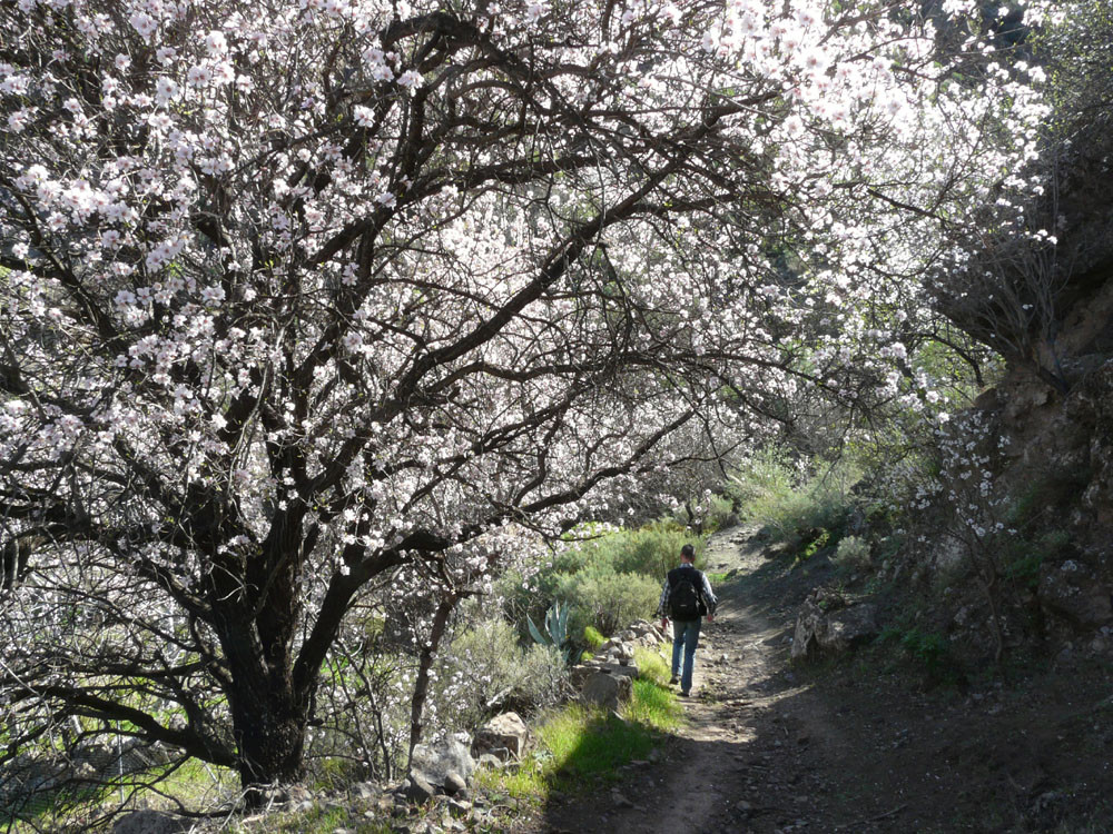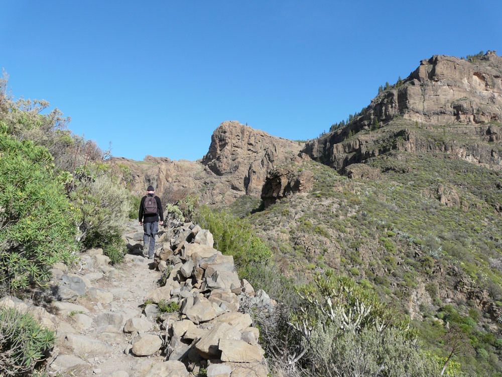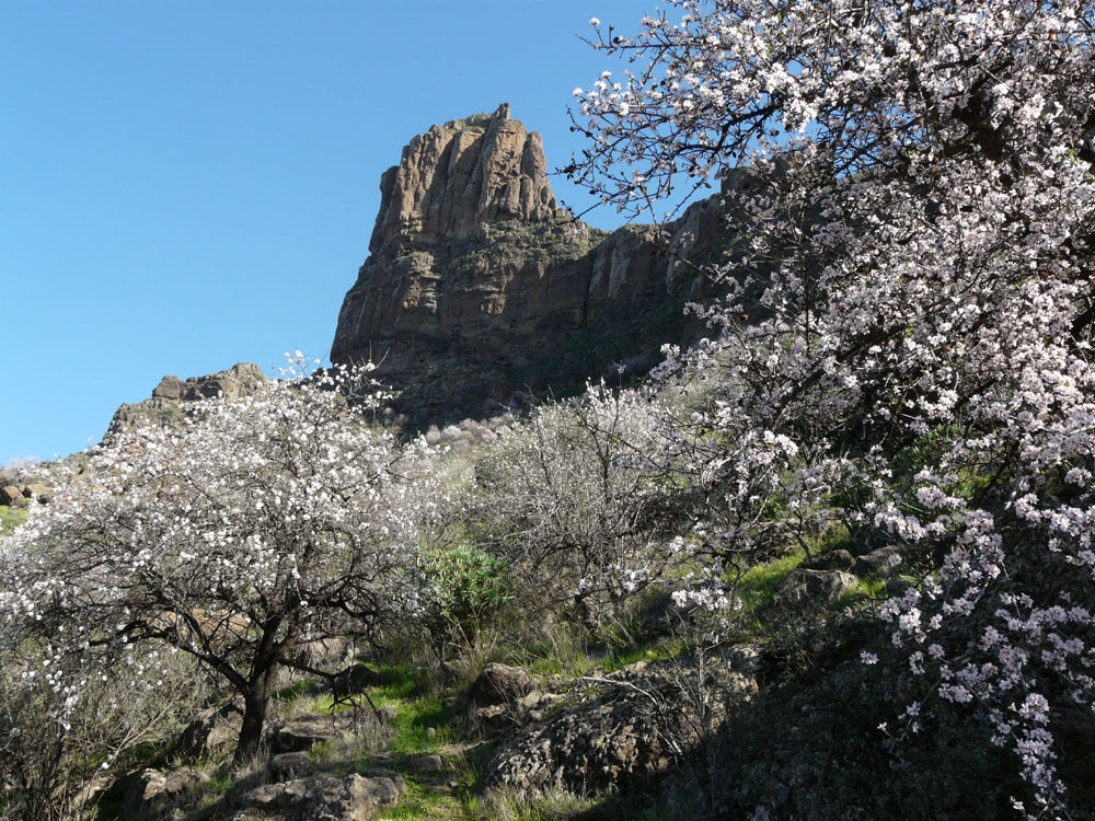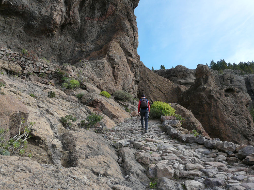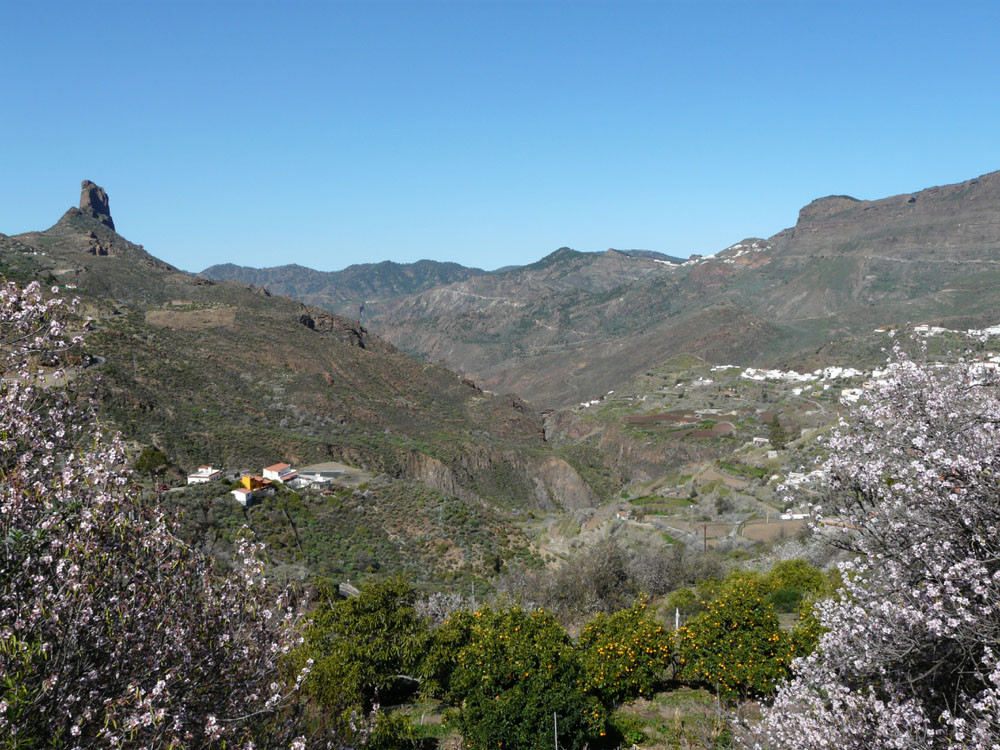 Diese lange Tour ist eine der ausgefallensten und schönsten auf Gran Canaria. Um immer das beste Fotolicht zu haben, starten wir an der Straßenkurve am Cruz de Timagada, einige Kilometer südlich von Tejeda. Auf dem Fahrweg steigen wir kurz zur Degollada de las Moradas an und gehen nun stets geradeaus auf schönem Wanderweg in Richtung Tejeda. Kurz vor dem Ort treffen wir in einer Kurve wieder auf die Straße und folgen ihr ins Ortszentrum. An der Kirche gehen wir die steile Straße bergab und kommen am kleinen Heimatmuseum vorbei. Wenn die Straße eine scharfe Linkskurve macht, zweigen wir rechts auf einen Pfad ab, der allmählich in den Barranco hinabführt. Hier ist der Verlauf etwas unübersichtlich - im Zweifelsfall einen Ortskundigen fragen. Im Talgrund treffen wir auf eine kastenförmige Wasserrinne, in oder neben der wir nun über eine Stunde durch den spannenden Barranco gehen. Kleinere Hindernisse oder Strecken, wo die Leitung verschwindet, müssen wir mit etwas Spürsinn umgehen. Wenn sich der Barranco etwas weitet, heißt es aufpassen. Dort wo eine Rampe die Rinne verlässt, steigen wir links auf einem schmalen Pfad aus dem Grund des Barrancos heraus. Wir kommen kurz danach zu einem einfachen Gebäude und folgen nun recht deutlichen Pfaden immer bergauf, bis wir auf einen nicht mehr genutzten Fahrweg stoßen. Auf diesem gehen wir in mehreren Kehren zur Asphaltstraße unter dem Roque Ventaiga (oder Bentaiga) empor. Dieser folgen wir nun nach links bis zur Hauptstraße in Richtung Tejeda. Wenn wir diese in einer scharfen Kurve erreichen, gehen wir rechts einige hundert Meter die Straße entlang, bis links ein Weg auf den Bergrücken hinaufführt. (Wenn man den Weg verpasst, kommt man auch auf der Straße zum Ausgangspunkt zurück!) Vom Bergrücken haben wir sehr schöne Blicke auf den Roque Nublo direkt vor uns. Schließlich erreichen wir wieder die Degollada de las Moradas und gehen nach rechts zum Startpunkt hinab.