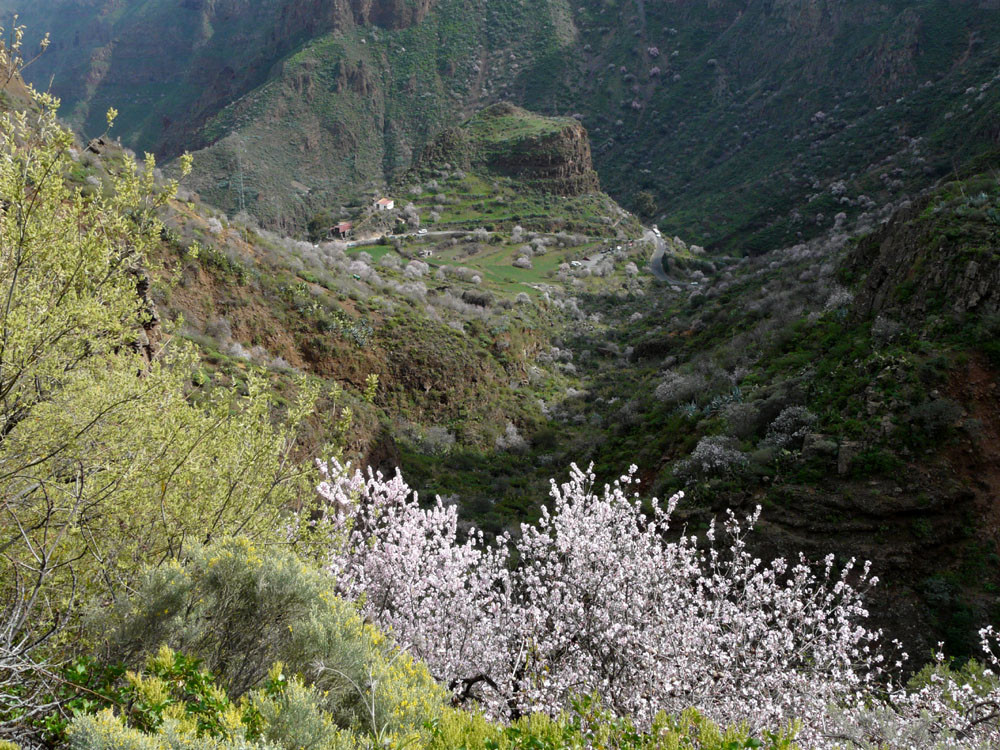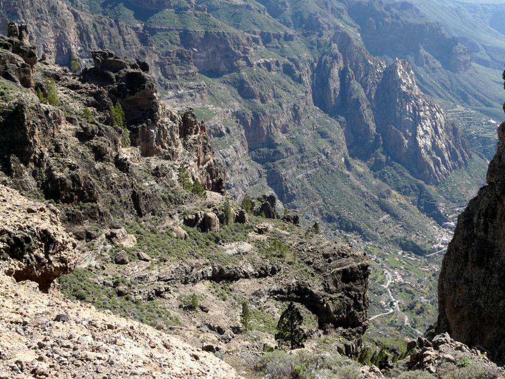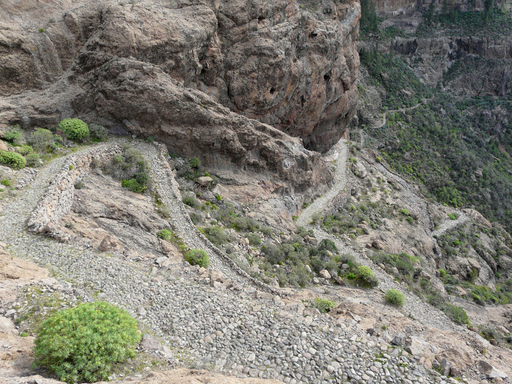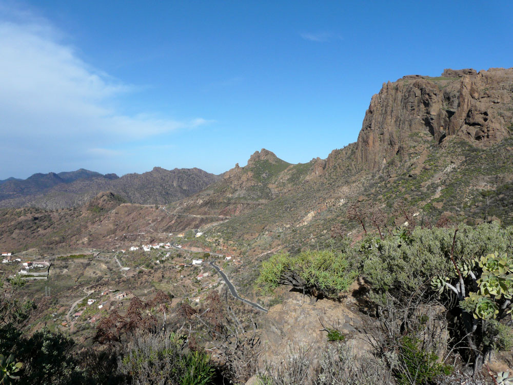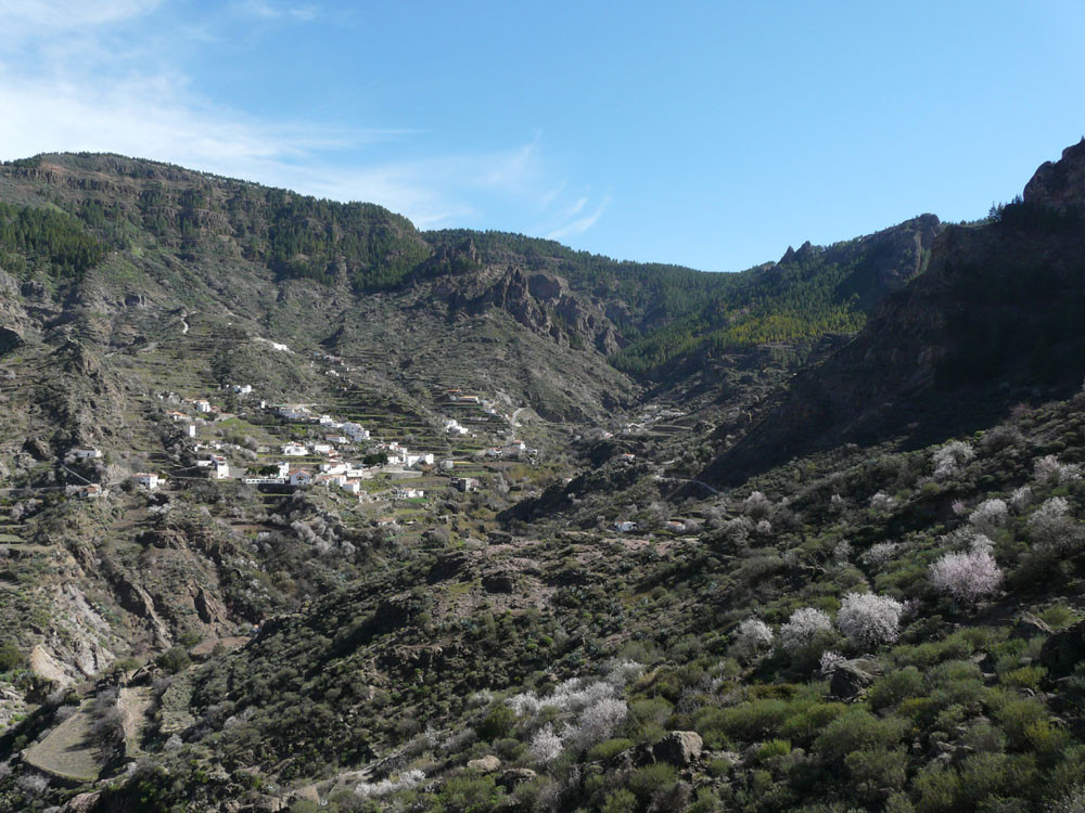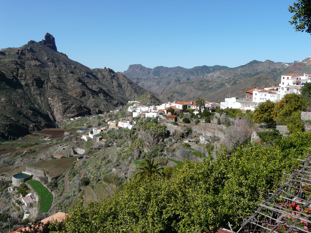 Diese lange Tour ist eine der ausgefallensten und schönsten auf Gran Canaria. Um immer das beste Fotolicht zu haben, starten wir an der Straßenkurve am Cruz de Timagada, einige Kilometer südlich von Tejeda. Auf dem Fahrweg steigen wir kurz zur Degollada de las Moradas an und gehen nun stets geradeaus auf schönem Wanderweg in Richtung Tejeda. Kurz vor dem Ort treffen wir in einer Kurve wieder auf die Straße und folgen ihr ins Ortszentrum. An der Kirche gehen wir die steile Straße bergab und kommen am kleinen Heimatmuseum vorbei. Wenn die Straße eine scharfe Linkskurve macht, zweigen wir rechts auf einen Pfad ab, der allmählich in den Barranco hinabführt. Hier ist der Verlauf etwas unübersichtlich - im Zweifelsfall einen Ortskundigen fragen. Im Talgrund treffen wir auf eine kastenförmige Wasserrinne, in oder neben der wir nun über eine Stunde durch den spannenden Barranco gehen. Kleinere Hindernisse oder Strecken, wo die Leitung verschwindet, müssen wir mit etwas Spürsinn umgehen. Wenn sich der Barranco etwas weitet, heißt es aufpassen. Dort wo eine Rampe die Rinne verlässt, steigen wir links auf einem schmalen Pfad aus dem Grund des Barrancos heraus. Wir kommen kurz danach zu einem einfachen Gebäude und folgen nun recht deutlichen Pfaden immer bergauf, bis wir auf einen nicht mehr genutzten Fahrweg stoßen. Auf diesem gehen wir in mehreren Kehren zur Asphaltstraße unter dem Roque Ventaiga (oder Bentaiga) empor. Dieser folgen wir nun nach links bis zur Hauptstraße in Richtung Tejeda. Wenn wir diese in einer scharfen Kurve erreichen, gehen wir rechts einige hundert Meter die Straße entlang, bis links ein Weg auf den Bergrücken hinaufführt. (Wenn man den Weg verpasst, kommt man auch auf der Straße zum Ausgangspunkt zurück!) Vom Bergrücken haben wir sehr schöne Blicke auf den Roque Nublo direkt vor uns. Schließlich erreichen wir wieder die Degollada de las Moradas und gehen nach rechts zum Startpunkt hinab.