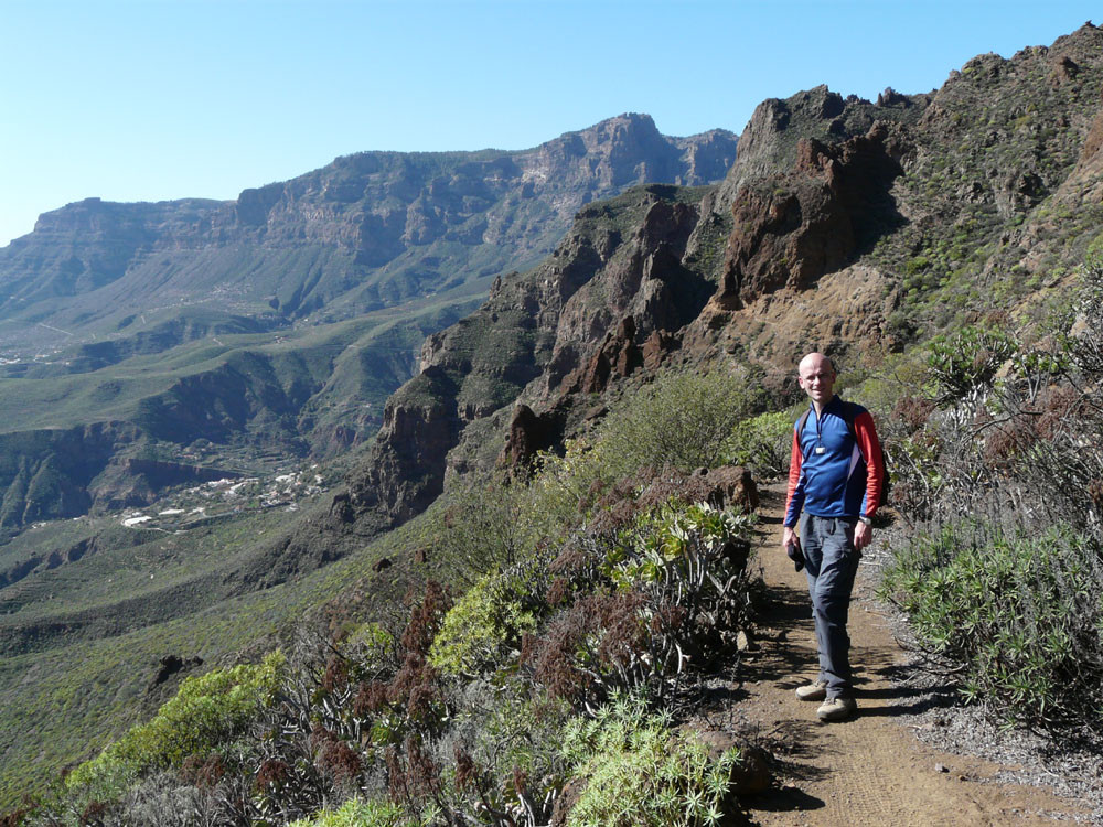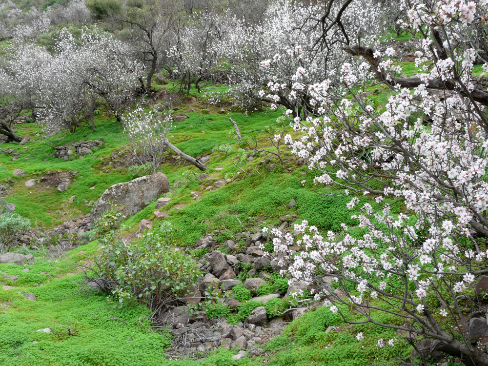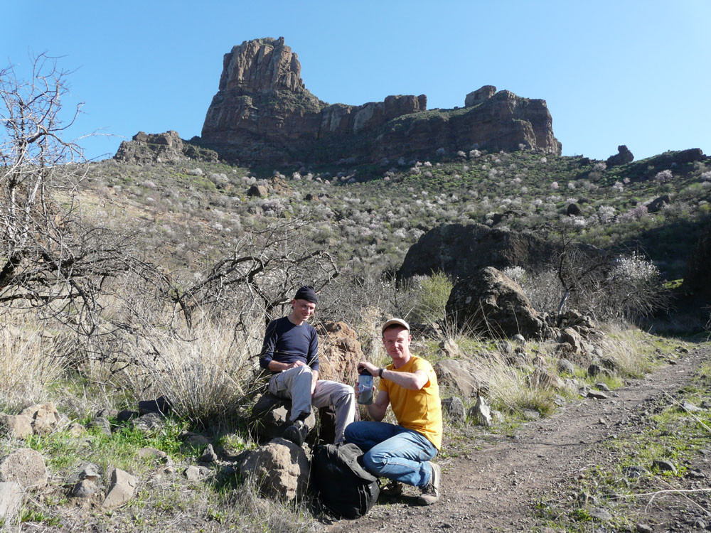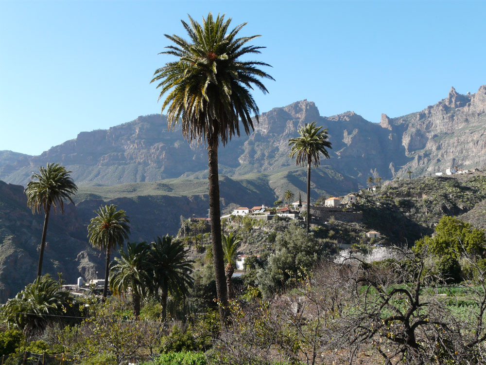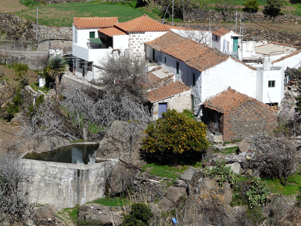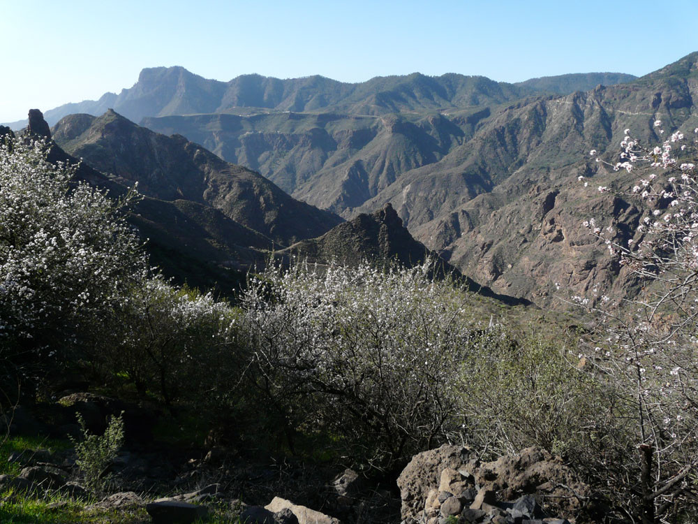 Diese lange Tour ist eine der ausgefallensten und schönsten auf Gran Canaria. Um immer das beste Fotolicht zu haben, starten wir an der Straßenkurve am Cruz de Timagada, einige Kilometer südlich von Tejeda. Auf dem Fahrweg steigen wir kurz zur Degollada de las Moradas an und gehen nun stets geradeaus auf schönem Wanderweg in Richtung Tejeda. Kurz vor dem Ort treffen wir in einer Kurve wieder auf die Straße und folgen ihr ins Ortszentrum. An der Kirche gehen wir die steile Straße bergab und kommen am kleinen Heimatmuseum vorbei. Wenn die Straße eine scharfe Linkskurve macht, zweigen wir rechts auf einen Pfad ab, der allmählich in den Barranco hinabführt. Hier ist der Verlauf etwas unübersichtlich - im Zweifelsfall einen Ortskundigen fragen. Im Talgrund treffen wir auf eine kastenförmige Wasserrinne, in oder neben der wir nun über eine Stunde durch den spannenden Barranco gehen. Kleinere Hindernisse oder Strecken, wo die Leitung verschwindet, müssen wir mit etwas Spürsinn umgehen. Wenn sich der Barranco etwas weitet, heißt es aufpassen. Dort wo eine Rampe die Rinne verlässt, steigen wir links auf einem schmalen Pfad aus dem Grund des Barrancos heraus. Wir kommen kurz danach zu einem einfachen Gebäude und folgen nun recht deutlichen Pfaden immer bergauf, bis wir auf einen nicht mehr genutzten Fahrweg stoßen. Auf diesem gehen wir in mehreren Kehren zur Asphaltstraße unter dem Roque Ventaiga (oder Bentaiga) empor. Dieser folgen wir nun nach links bis zur Hauptstraße in Richtung Tejeda. Wenn wir diese in einer scharfen Kurve erreichen, gehen wir rechts einige hundert Meter die Straße entlang, bis links ein Weg auf den Bergrücken hinaufführt. (Wenn man den Weg verpasst, kommt man auch auf der Straße zum Ausgangspunkt zurück!) Vom Bergrücken haben wir sehr schöne Blicke auf den Roque Nublo direkt vor uns. Schließlich erreichen wir wieder die Degollada de las Moradas und gehen nach rechts zum Startpunkt hinab.