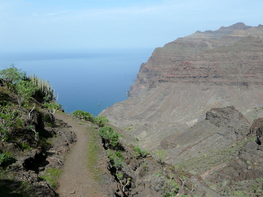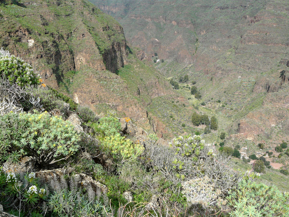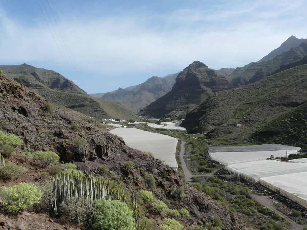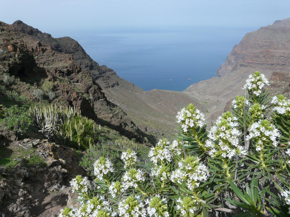 Wir starten in Tasártico, einem abgelegenen Dof im Westen der Insel. Wir folgen der Straße in Richtung Küste für einen knappen Kilometer durch Gewächshäuser mit Tomaten. Dann übersteigen wir eine Wasserleitung und steigen rechts der Straße einen Steig hinauf, dem wir stets bergan bis zur Degollada de Aguas Sabinas folgen. Von hier haben wir einen tollen Blick in den Barranco und den nur zu Fuß zu erreichenden Strand von Güigüí. Um ihn zu erreichen, wandern wir gut 500 Höhenmeter auf schön in den Hang gebautem Pfad hinab und machen am Meer angekommen eine ausgiebige Pause. Zurück geht es auf demselben Weg.