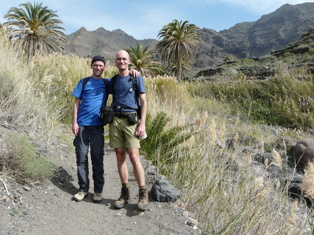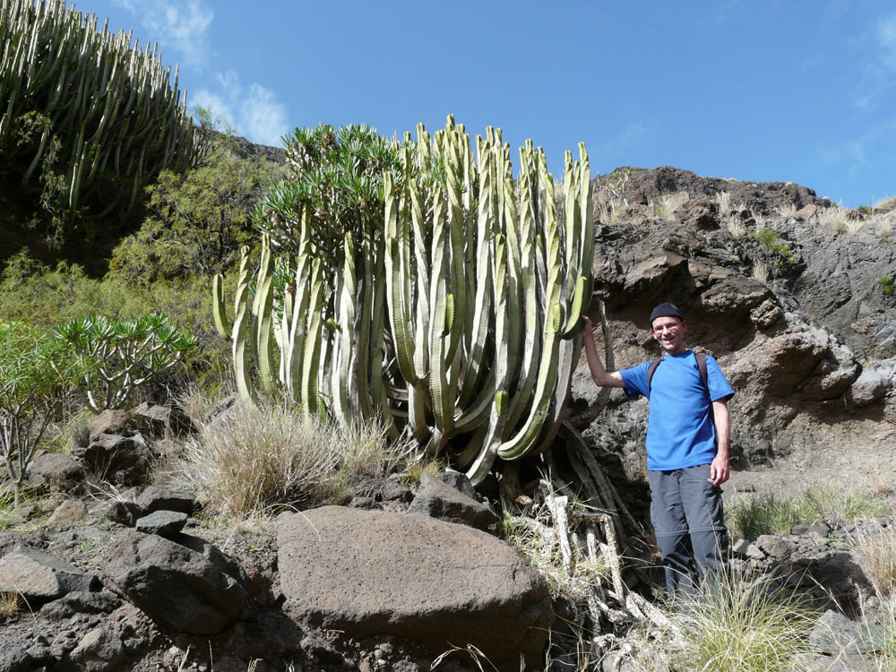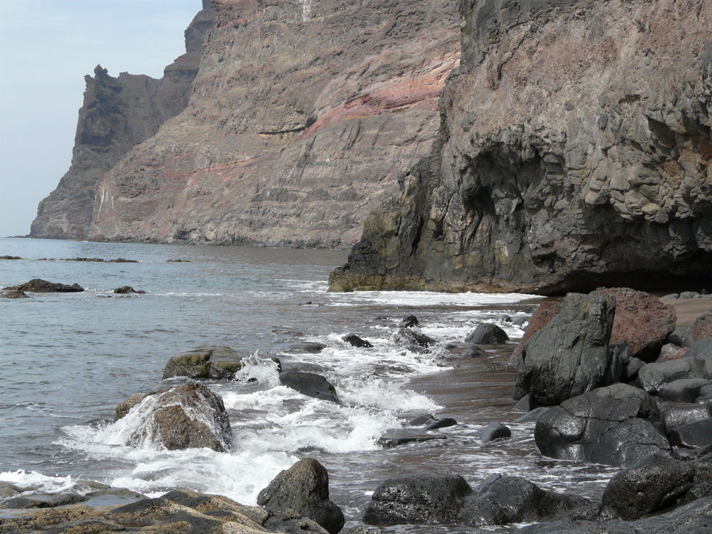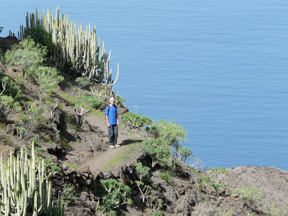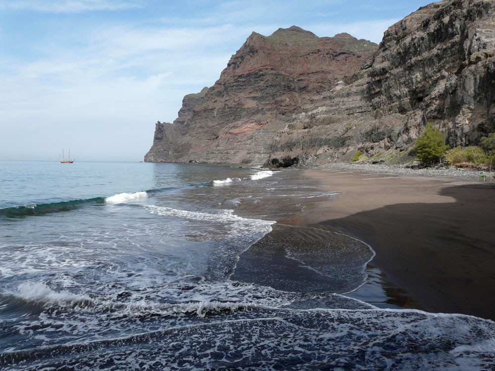 Wir starten in Tasártico, einem abgelegenen Dof im Westen der Insel. Wir folgen der Straße in Richtung Küste für einen knappen Kilometer durch Gewächshäuser mit Tomaten. Dann übersteigen wir eine Wasserleitung und steigen rechts der Straße einen Steig hinauf, dem wir stets bergan bis zur Degollada de Aguas Sabinas folgen. Von hier haben wir einen tollen Blick in den Barranco und den nur zu Fuß zu erreichenden Strand von Güigüí. Um ihn zu erreichen, wandern wir gut 500 Höhenmeter auf schön in den Hang gebautem Pfad hinab und machen am Meer angekommen eine ausgiebige Pause. Zurück geht es auf demselben Weg.