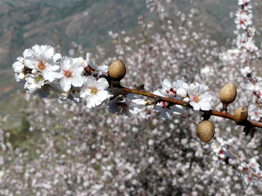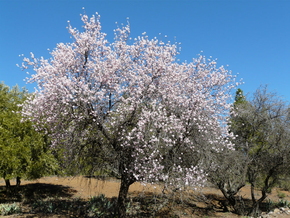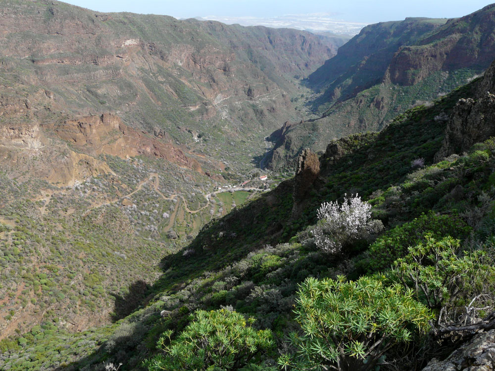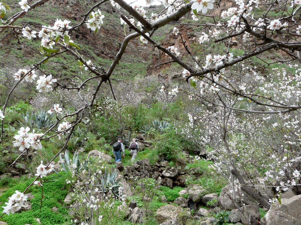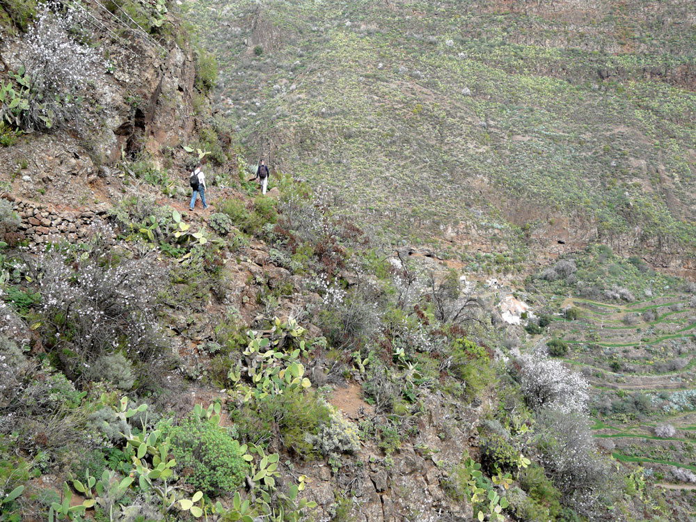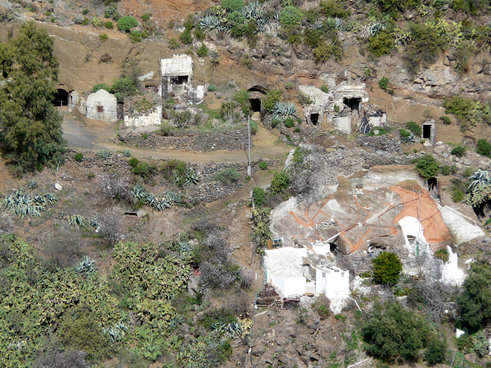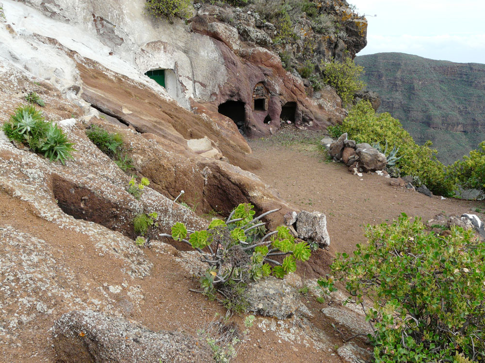 Der Barranco de Guayadeque nahe Agüimes war schon in vorspanischer Zeit dicht besiedelt, wovon heute noch viele früher als Wohnung genutzte Höhlen in den Felswänden zeugen. Wir beginnen die Wanderung in Cuevas Bermejas und gehen an einigen Höhlenwohnungen vorbei an der südlichen Barrancowand bergan. Ein gut ausgebauter Weg leitet uns in zahlreichen Kehren bis auf den oberen Schluchtrand. Diesem folgen wir nun westlich weiter bergan und kommen an weiteren Höhlen vorbei. Teilweise weglos oder auf vagen Pfadspuren erreichen wir den Sattel Pino Cazado. Wir könnten bereits hier nach Montana de las Tierras hinabsteigen, doch wir gehen noch weiter geradeaus hoch über der Schlucht bleibend. Der Weg wird nun wieder deutlicher. Bald kommt eine weitere Weggabelung, bei der wir rechts auf den Saumpfad abbiegen, der herrlich am Berghang entlang langsam in den Barranco hinabführt. Bei den wenigen Häusern von Cruce de Olivo stoßen wir auf einen Querweg, dem wir rechts folgen und sofort danach zur Piste kommen, auf der wir bergab nach Montana de las Tierras gehen. Von hier laufen wir auf der ruhigen Straße im Grund des Barrancos nach Cuevas Bermejas zurück.