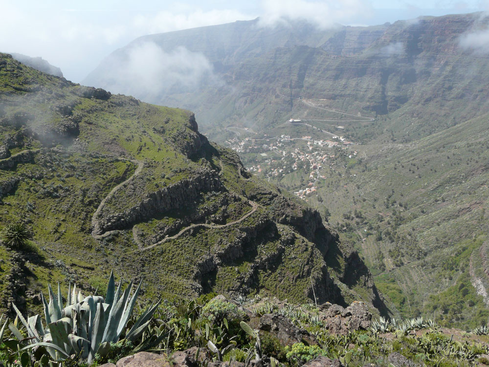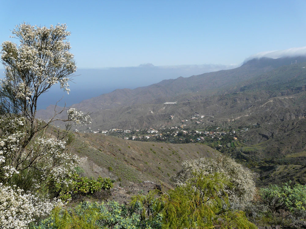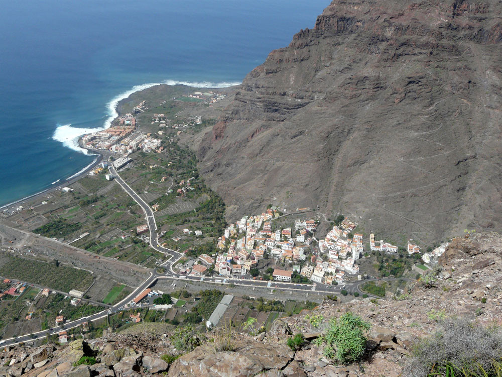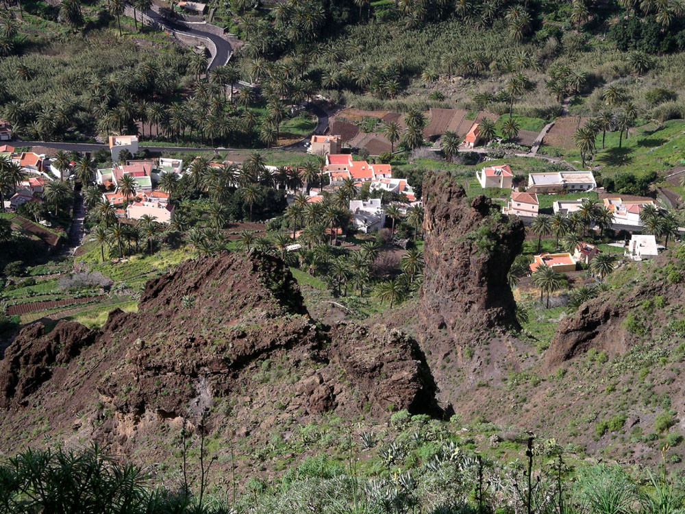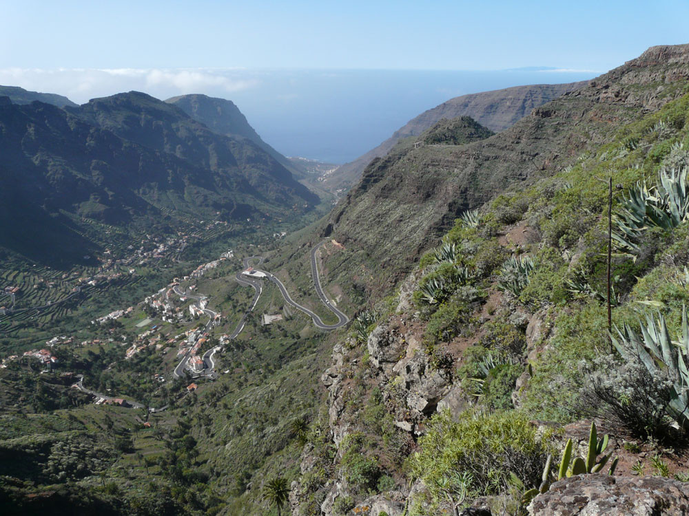 3. Mit dem Bus zum Roque Agando. Von hier Abstieg nach Bechijigua und durch den Barranco de Benchijigua nach El Cabezo. Von hier langes Asphaltstück auf wenig befahrener Straße nach Playa Santiago und von dort mit dem Garajonay Expres nach Valle Gran Rey. (Alternativ kann man auch von der Höhenstraße an der Casita Olsen beginnend über Imada oder El Azadoe nach Playa de Santiago absteigen.) Achtung: Alle Abstiegsvarianten sind sehr lang! Abfahrzeiten der Schnellfähre beachten!