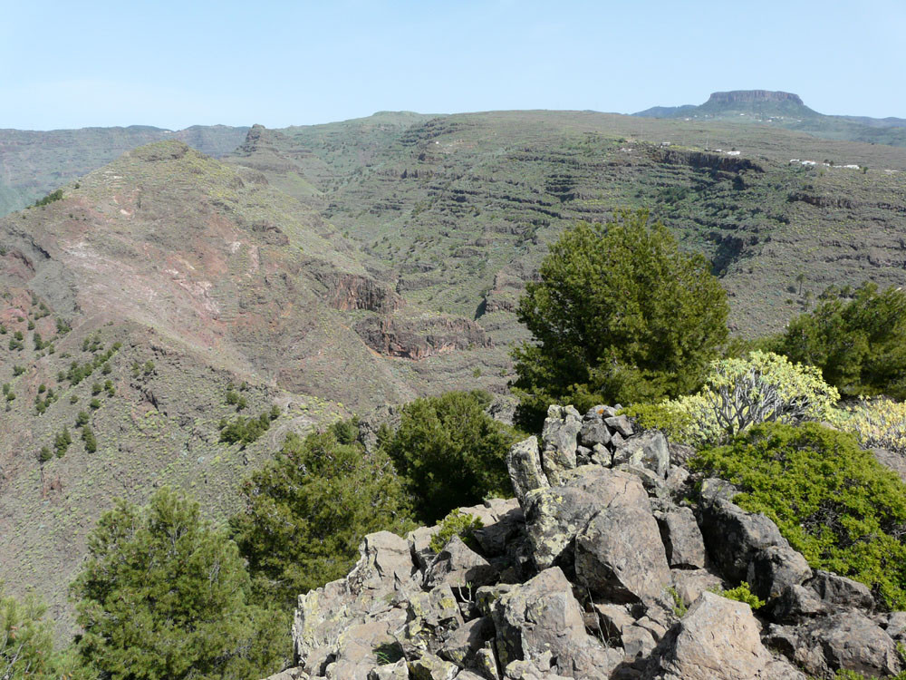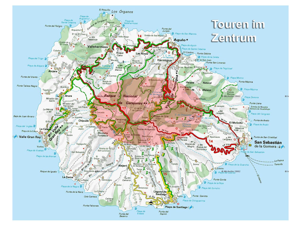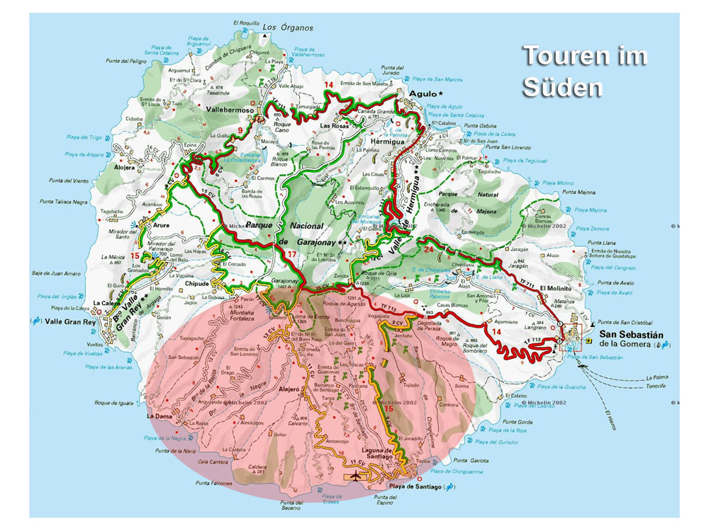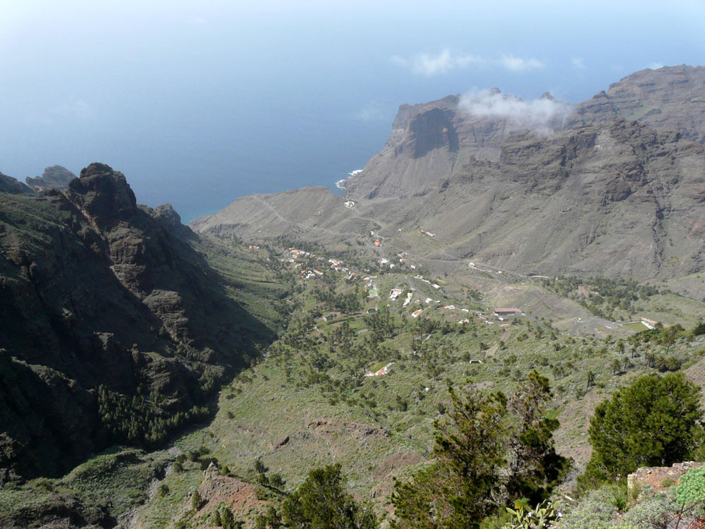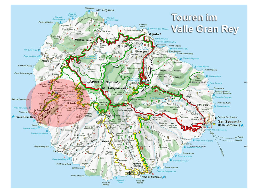 3. Mit dem Bus zum Roque Agando. Von hier Abstieg nach Bechijigua und durch den Barranco de Benchijigua nach El Cabezo. Von hier langes Asphaltstück auf wenig befahrener Straße nach Playa Santiago und von dort mit dem Garajonay Expres nach Valle Gran Rey. (Alternativ kann man auch von der Höhenstraße an der Casita Olsen beginnend über Imada oder El Azadoe nach Playa de Santiago absteigen.) Achtung: Alle Abstiegsvarianten sind sehr lang! Abfahrzeiten der Schnellfähre beachten!