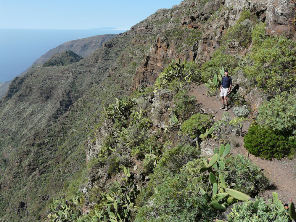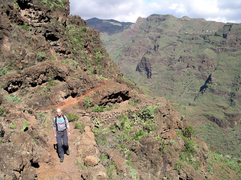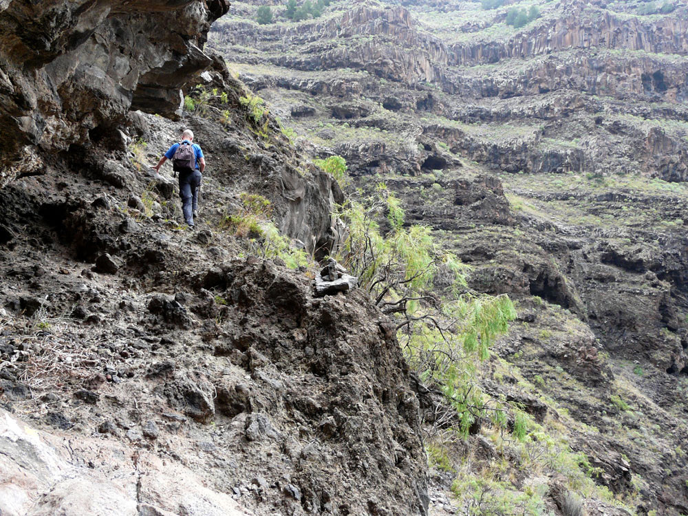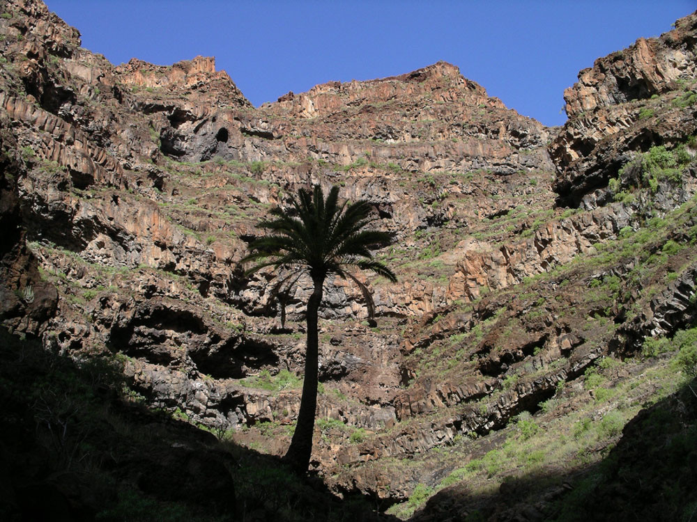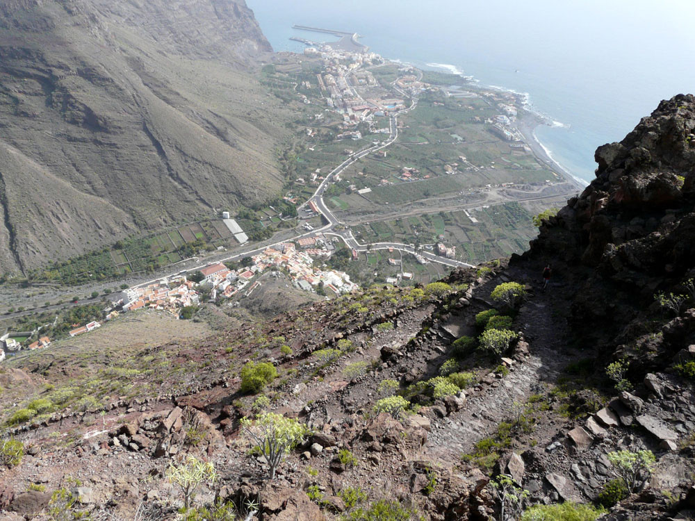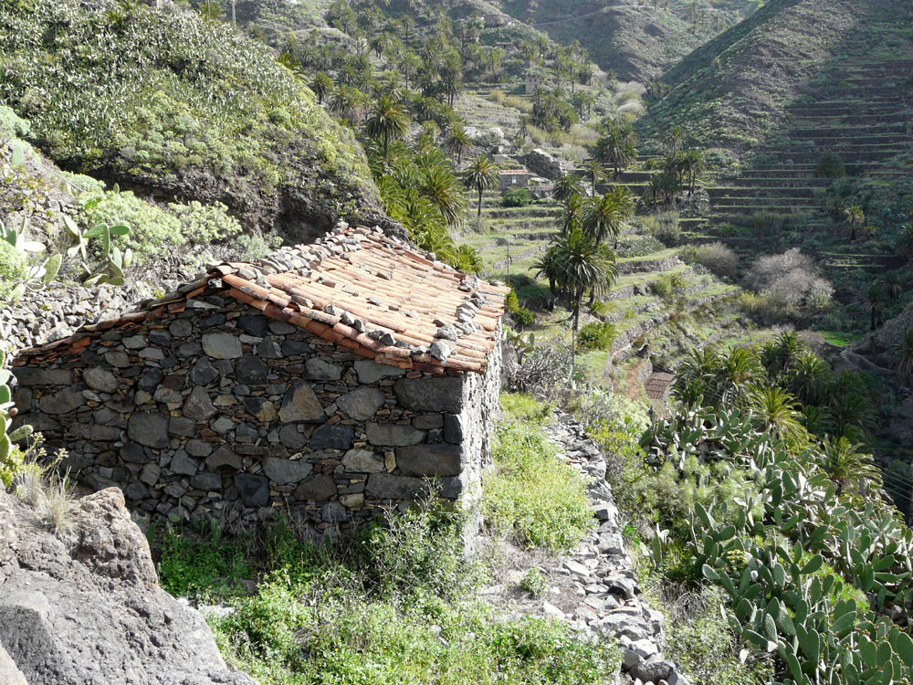 3. Vom Hafen von Vueltas auf der Piste entlang der Küste in den Barranco de Argaga. In diesem zunächst auf Fahrweg, dann auf teilweise steilem und ausgesetztem Kletterpfad hinauf nach Gerián. Von dort in das Tal hinab und zum "Kirchenpfad" queren. Auf diesem zurück ins Valle Gran Rey.