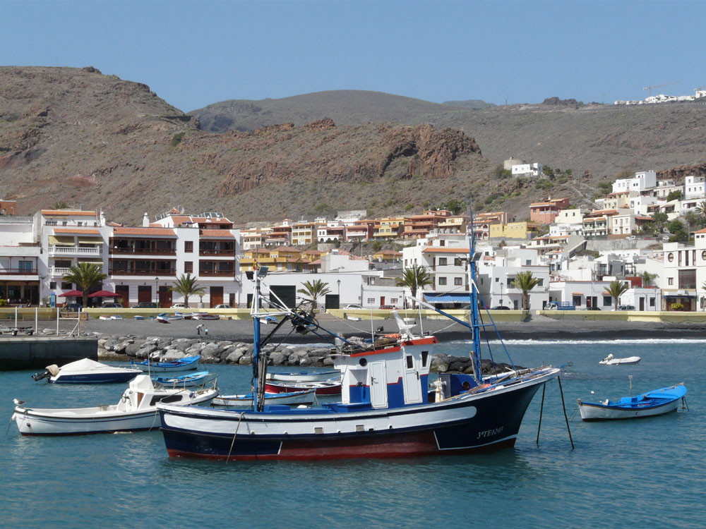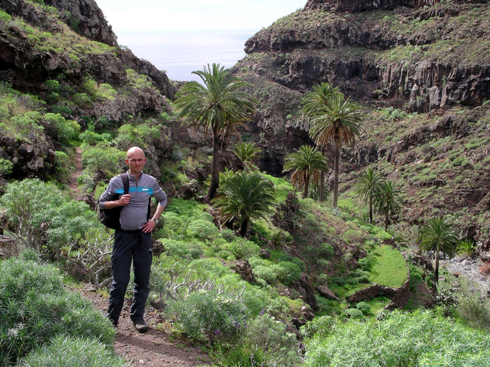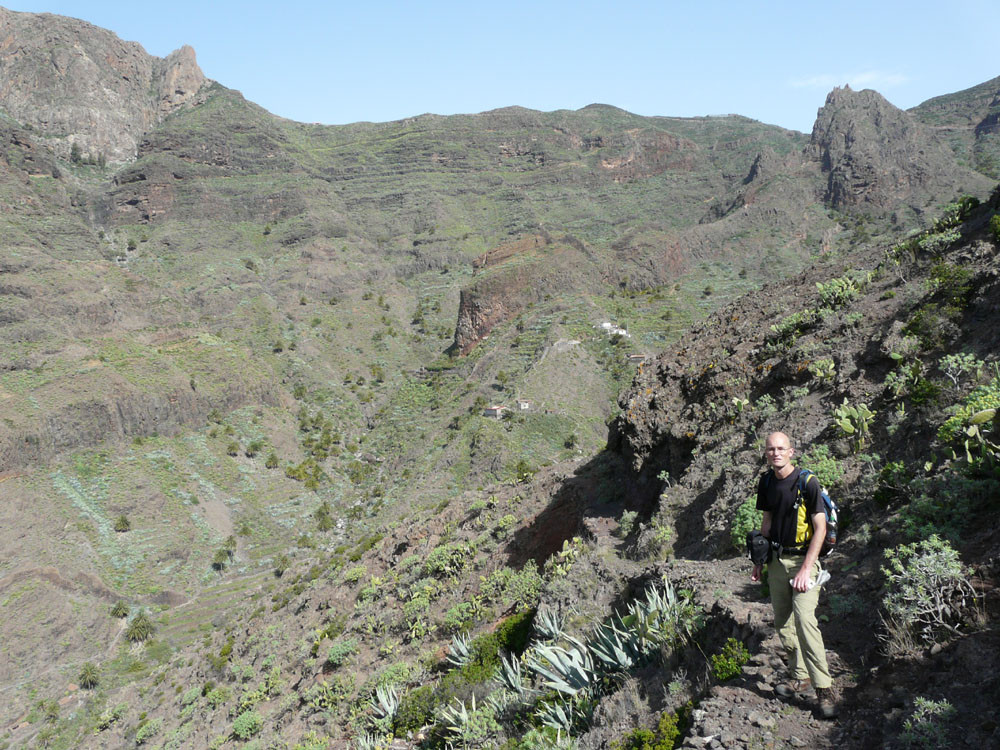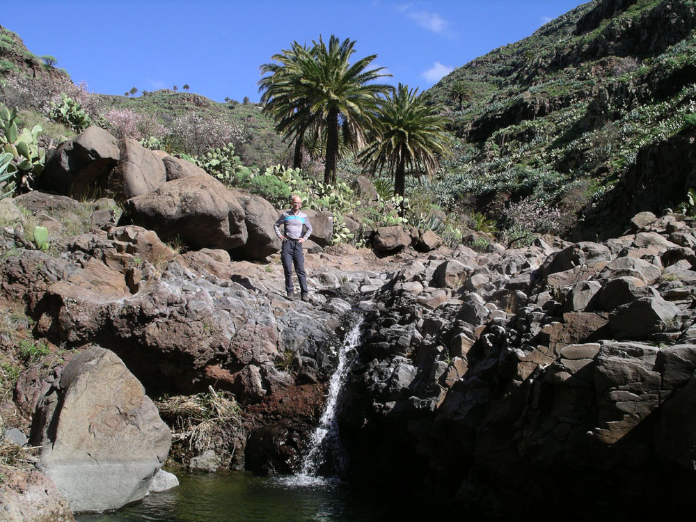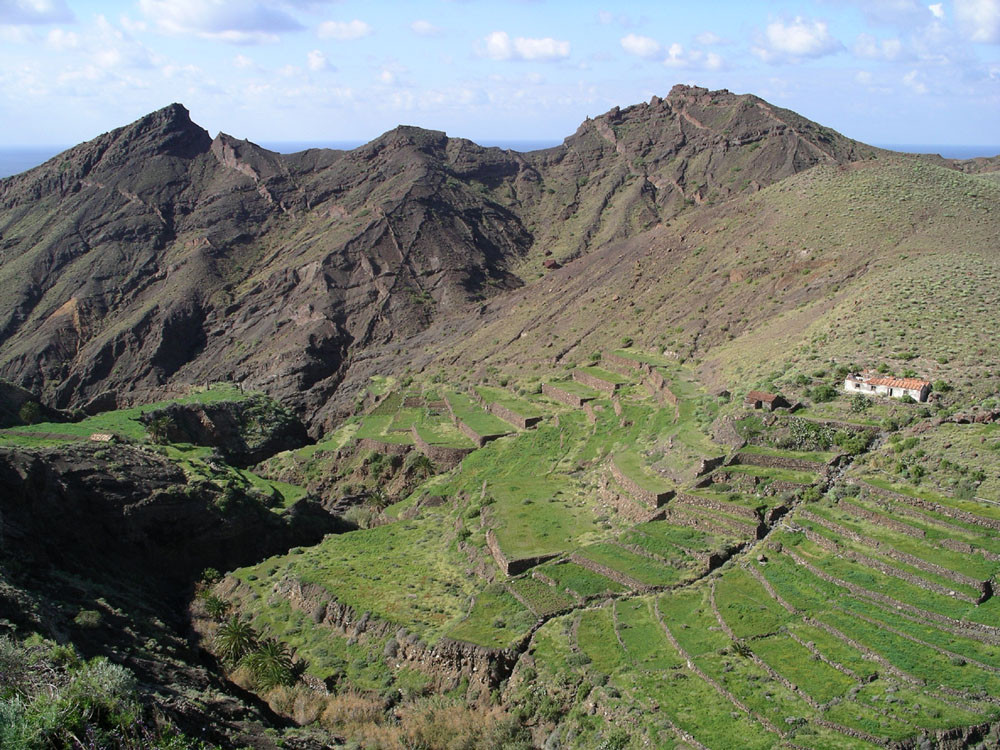 3. Vom Hafen von Vueltas auf der Piste entlang der Küste in den Barranco de Argaga. In diesem zunächst auf Fahrweg, dann auf teilweise steilem und ausgesetztem Kletterpfad hinauf nach Gerián. Von dort in das Tal hinab und zum "Kirchenpfad" queren. Auf diesem zurück ins Valle Gran Rey.