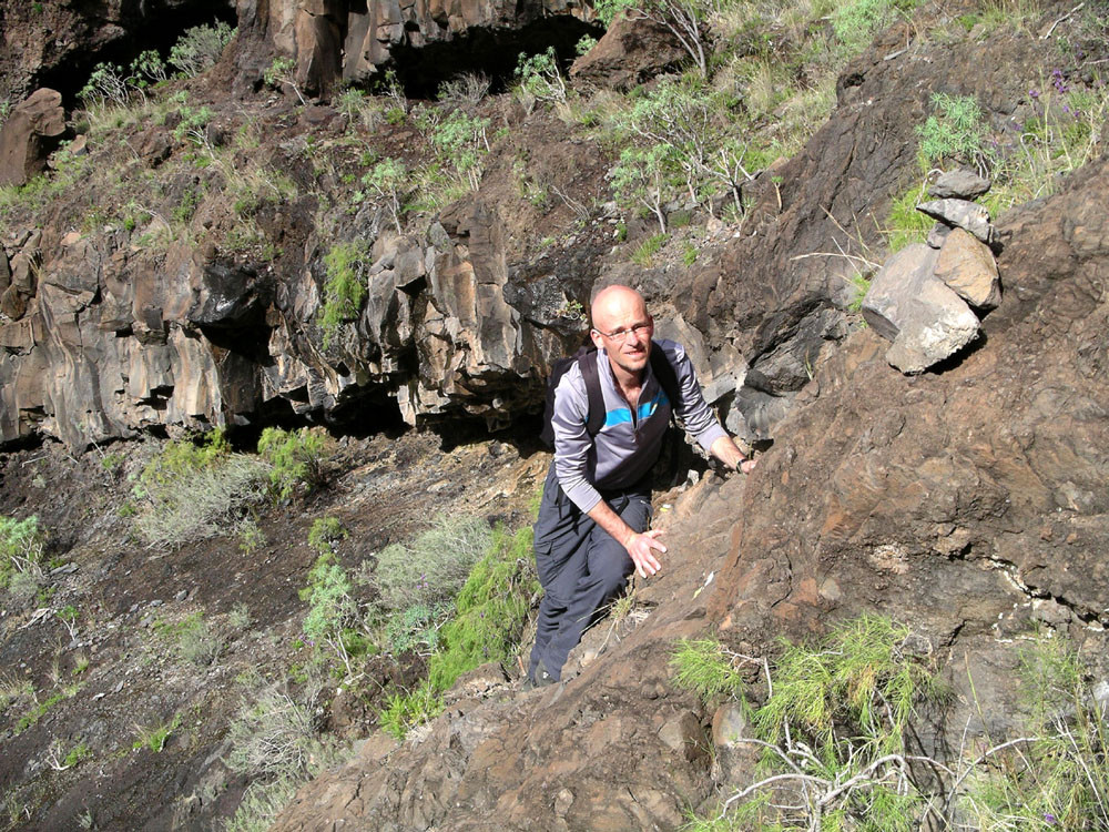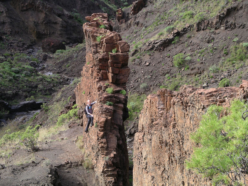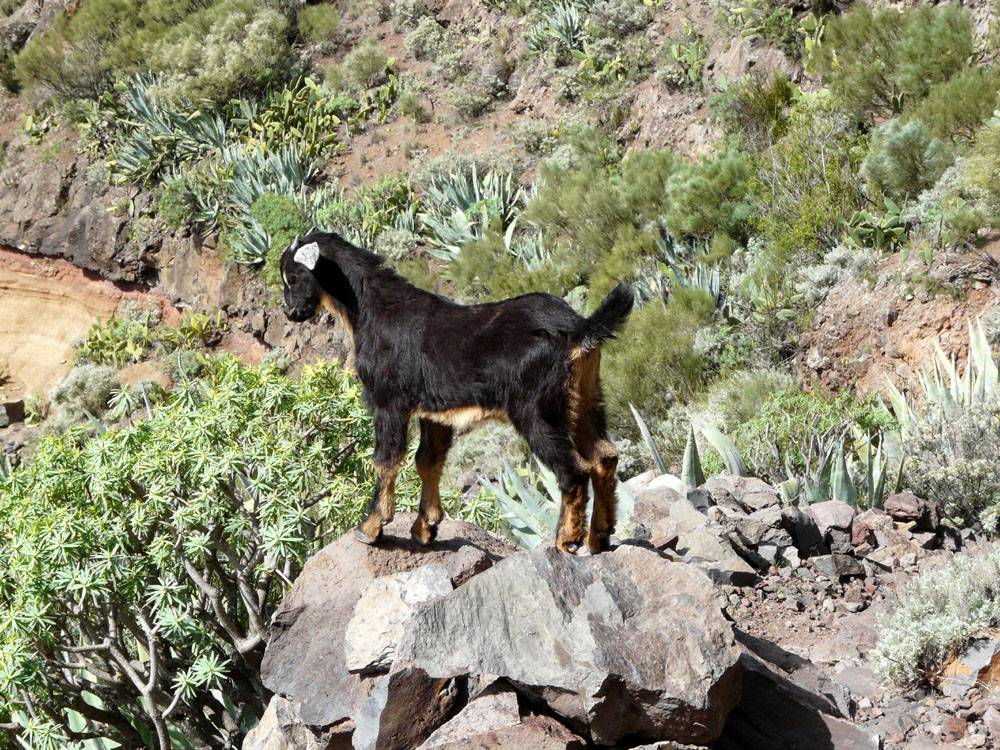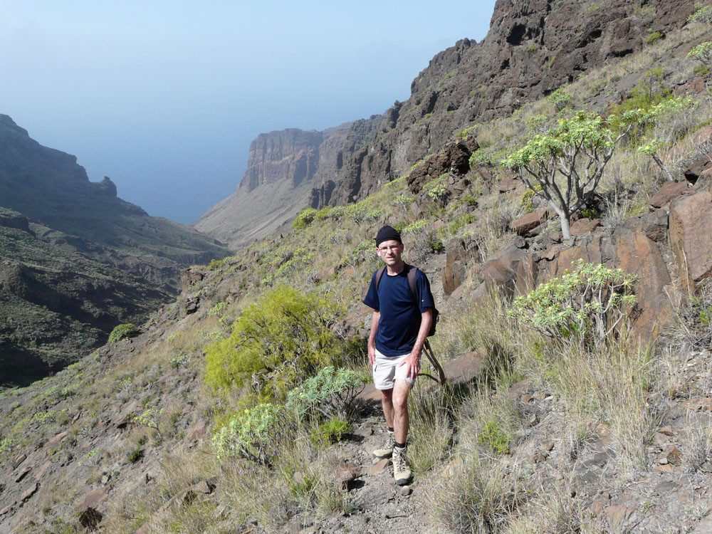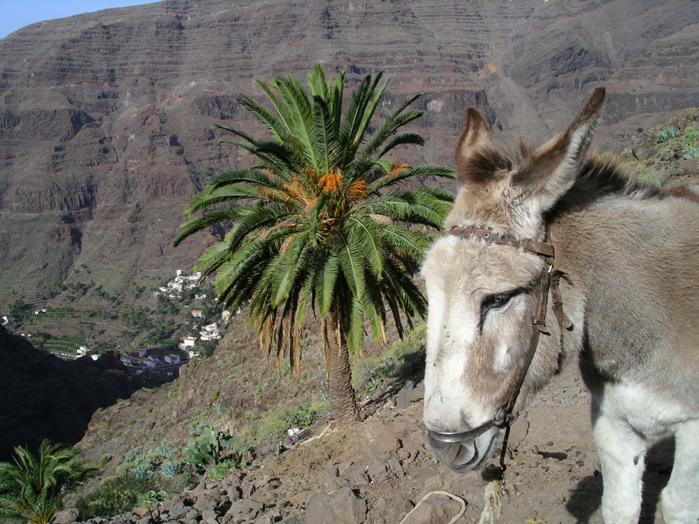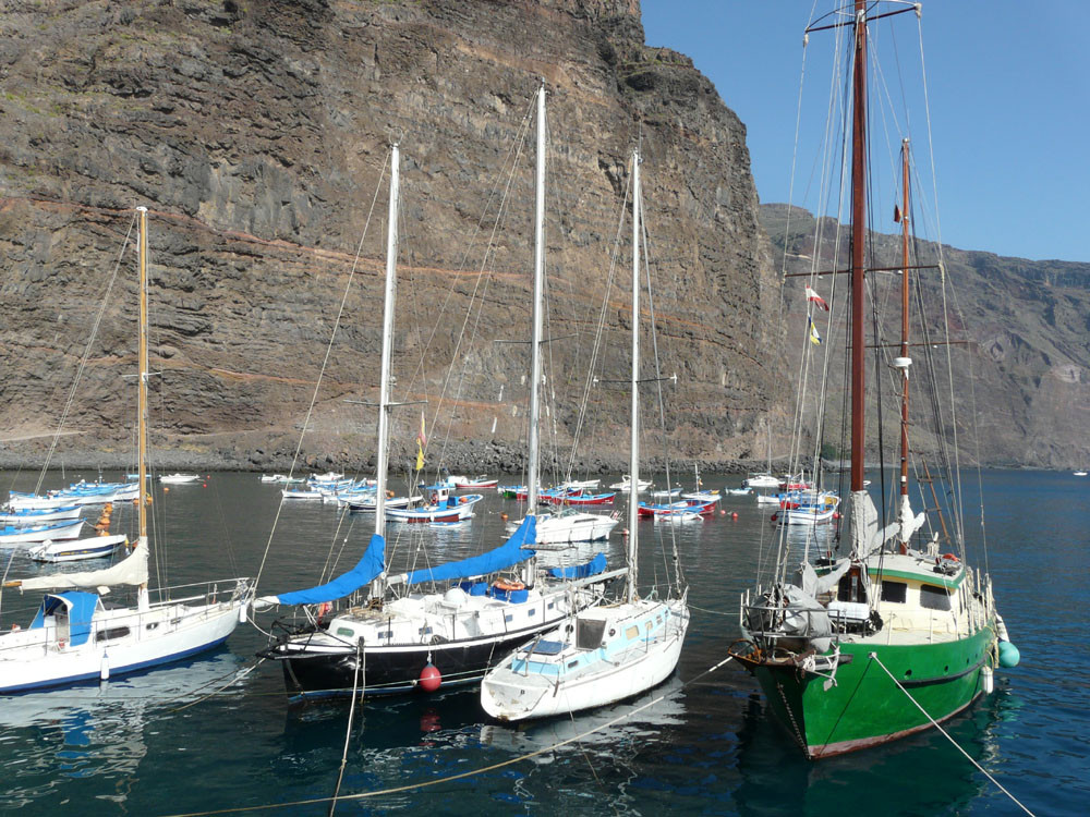 3. Vom Hafen von Vueltas auf der Piste entlang der Küste in den Barranco de Argaga. In diesem zunächst auf Fahrweg, dann auf teilweise steilem und ausgesetztem Kletterpfad hinauf nach Gerián. Von dort in das Tal hinab und zum "Kirchenpfad" queren. Auf diesem zurück ins Valle Gran Rey.