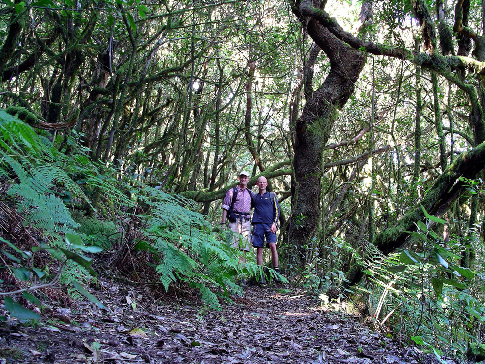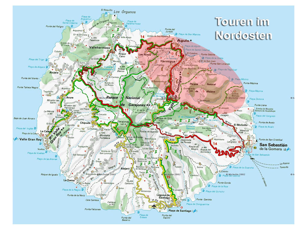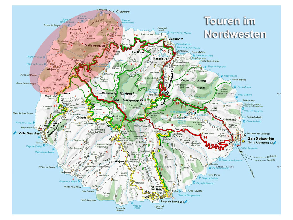 1. Von Chipude ein Stück auf Straße nach El Apartadero und zum Sattel unterhalb der Fortaleza. (Evtl. kleiner Abstecher zum Gipfel der Fortaleza.) Auf dem Bergrücken zur Piste und von dort auf Höhenweg nach Igualero. Über Forstwege zum Gipfel des Garajonay, dem höchsten Punkt der Insel. Auf Forstpisten und später auf Pfad durch Terrassenfelder über Los Manantinales zurück nach Chipude.