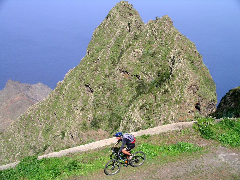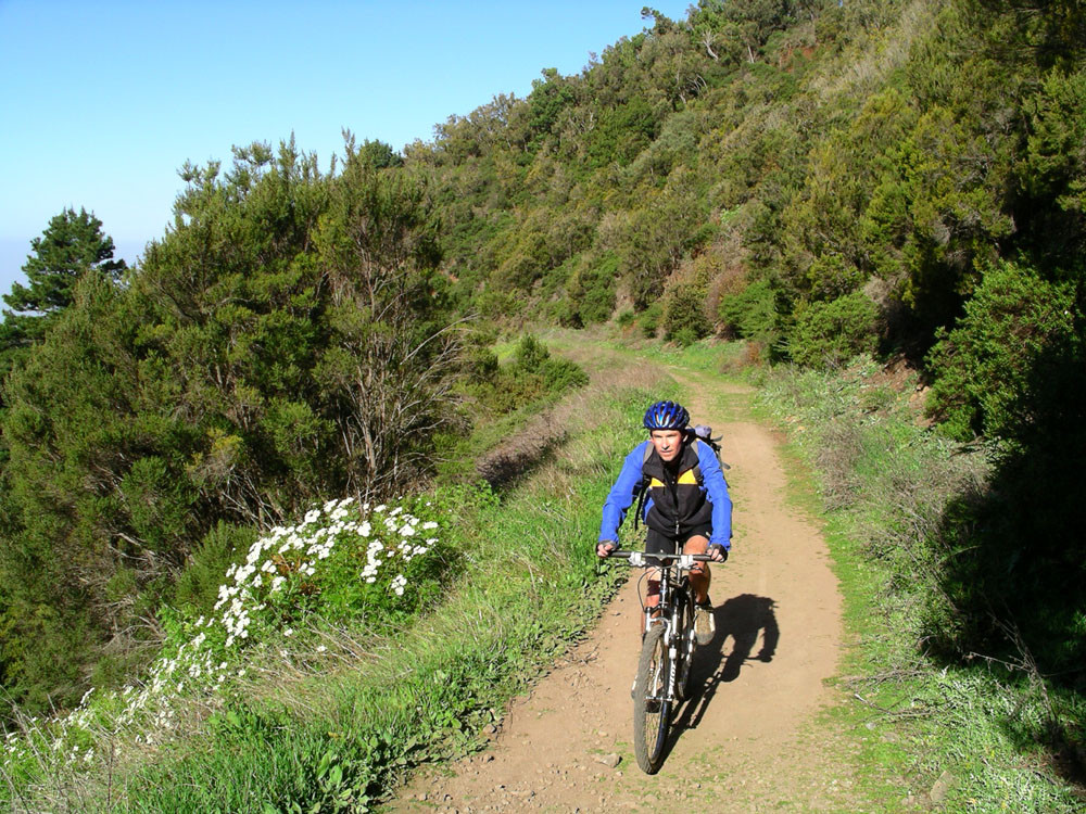 Von Hermigua auf der Hauptstraße in weiten Kehren hinauf bis zur Kreuzung unterhalb der Ermita de Nuestra Senora de Guadaloupe. Hier links auf die Straße nach San Sebastián. Mit tollen Blicken auf die alten Vulkanschlote Los Roques und durch mehrere Tunnels (können z.T. auf alter Straße umfahren werden) bis zum Abzweig (links) der Piste Camino Forestal de Majona. Ab hier das große Bikevergnügen auf guter Piste meist bergab durch einsame Berglandschaft bis hinunter nach Hermigua.