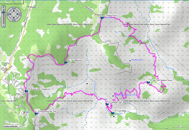 Kurz darauf ermöglichen einige Trampelpfade den Zugang zum North Campground (6), 2425 m. Der Rim Trail verläuft nun teilweise mir schönen Blicken entlang der Abbruchkante, zwischendurch überqueren wir aber auch Wiesen und Sandflächen im lichten Kiefernwald. Nachdem wir den höchsten Punkt der Tour, 2480 m, überschritten haben, geht es nur noch sanft abwärts, bis wir wieder den Fairyland Point (1) erreichen.