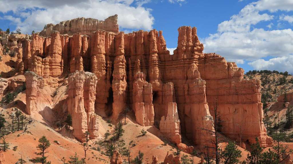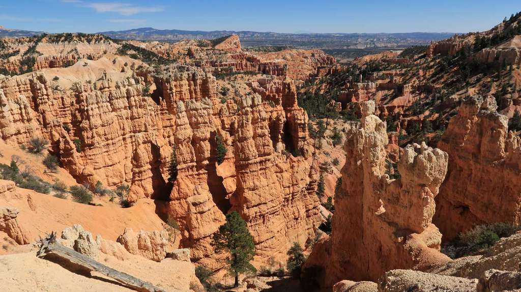 Bereits vom Fairyland Point (1), 2360 m, bietet sich ein wirklich eindrucksvoller Blick in einen Talkessel mit bizarren Felsnadeln, die auch am Vormittag im Gegenlicht ein schönes Farbspiel entwickeln. Am Ende unserer Tour werden sie mit der Sonne in unserem Rücken ganz anders wirken. Die Rundwanderung wird hier im Uhrzeigersinn beschrieben, sodass wir uns auf dem guten Weg links halten und allmählich in den Fairyland Canyon gut 150 Höhenmeter hinabsteigen. Dabei ergeben sich immer neue Anblicke der gewaltigen Hoodoos mit dem Bergrücken der Boat Mesa im Hintergrund. Nach gut 2 km haben wir den tiefsten Punkt erreicht und der Gegenanstieg beginnt. Auf der letzten Geraden vor dem Sattel (2), 2285 m, der uns in das Tal des Campbell Creek überleitet, haben wir wunderbare Blicke über den Fairyland Canyon auf die dahinter aufragenden Felsklippen und -türme. An ihrem Fuß erstrecken sich rötliche Schutthänge, die von auffälligen weißen Schichten durchzogen sind.