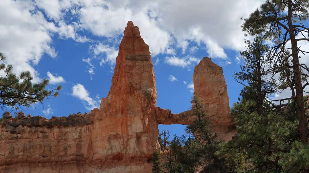 Unter den festungsartigen Ausläufern der Boat Mesa geht es nun mit leichten Gegenanstiegen hinab zum Campbell Creek (3), 2220 m. Hier sollte man den etwa 300 m langen Abstecher zur Tower Bridge genannten Felsformation (4), 2210 m, die hoch über uns zu schweben scheint, nicht verpassen. Zurück auf dem Hauptweg geht es nun auf einem Rücken fast 2,5 km in zahlreichen Windungen stetig bergan. Dabei erblicken wir im Süden die leicht erkennbare Felswand der China Wall. Am Ende des Anstiegs treffen wir auf den Rim Trail (5), 2425 m, dem wir nach rechts folgen.