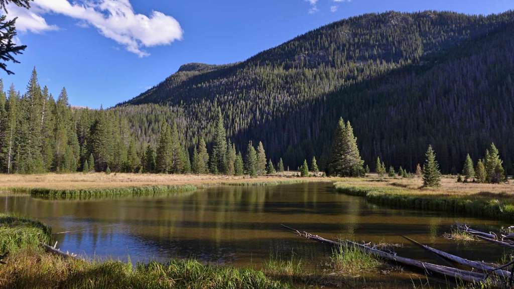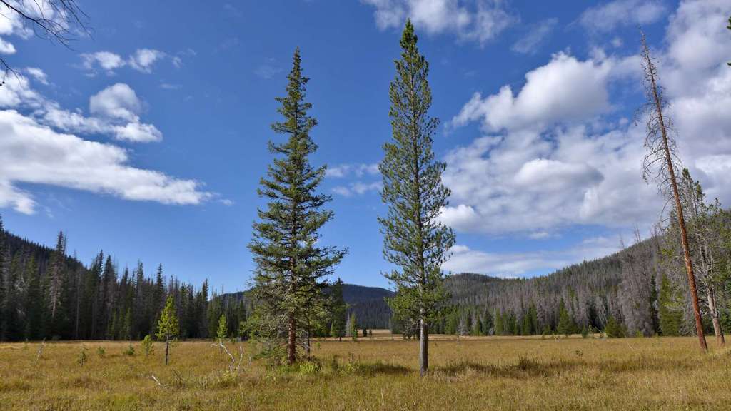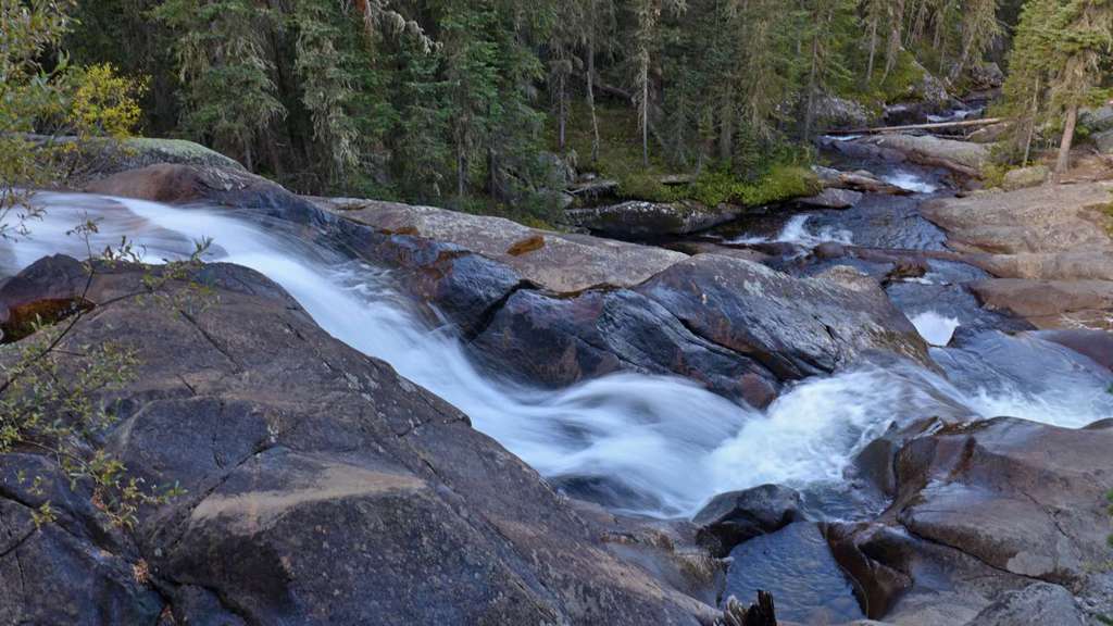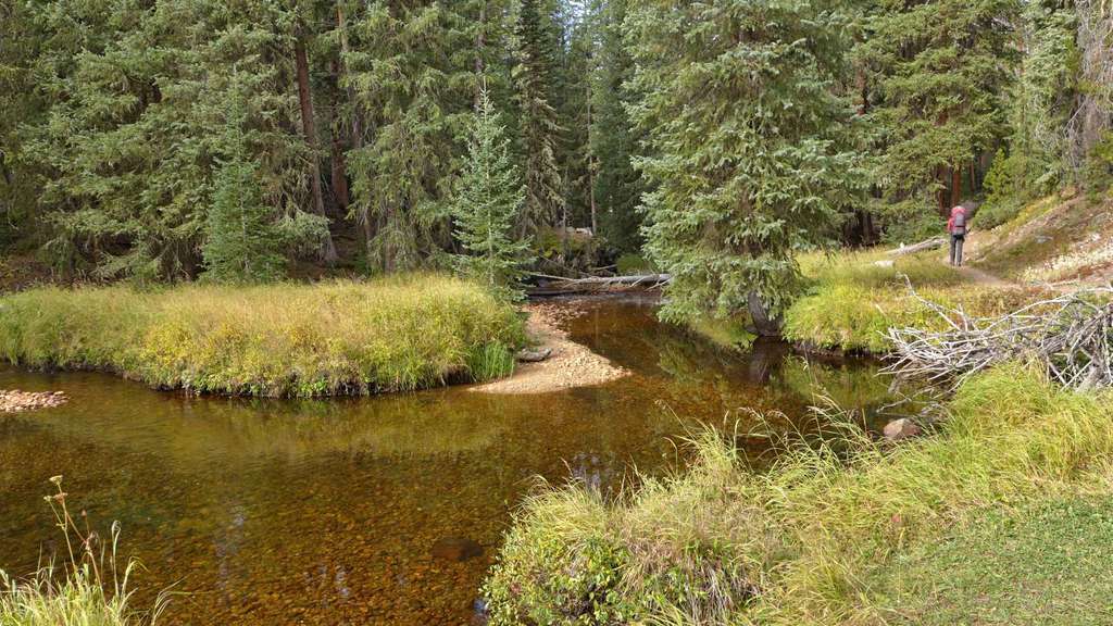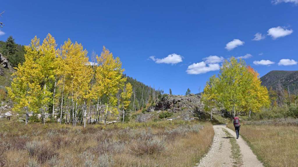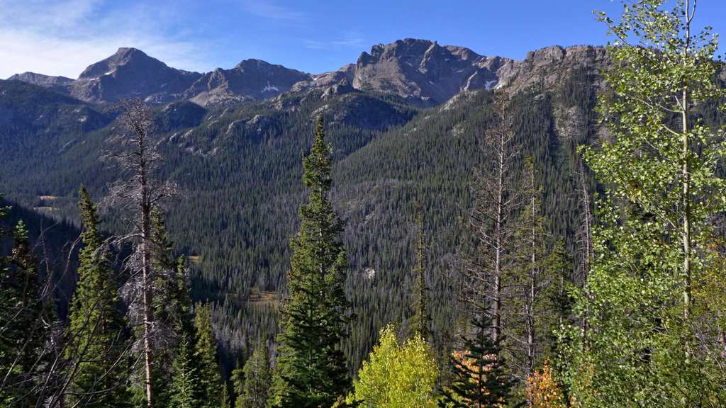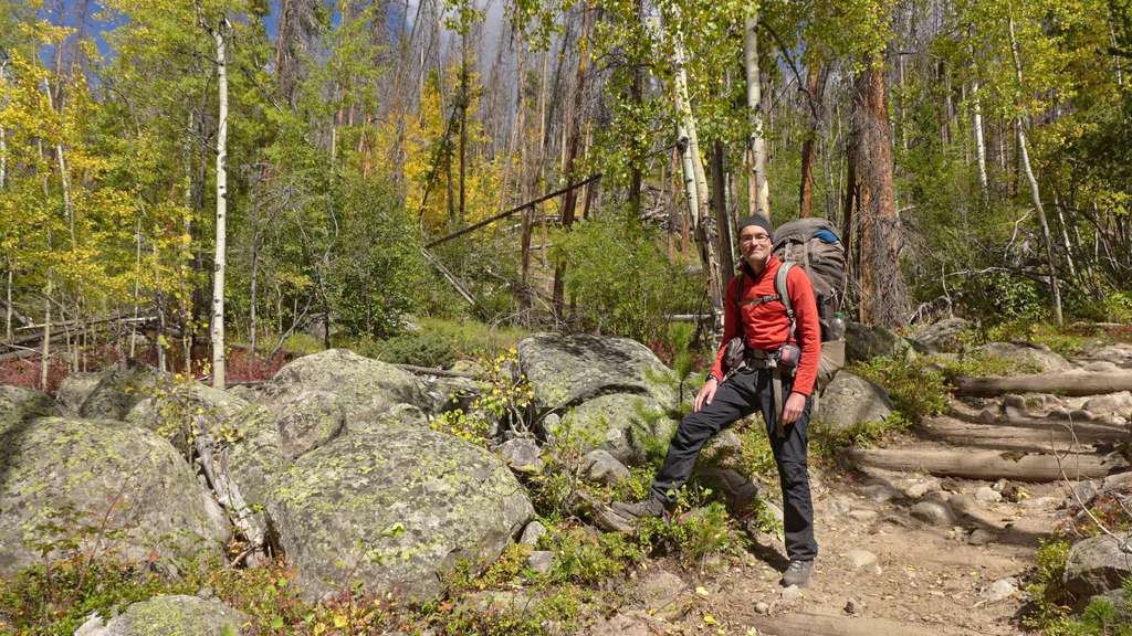 Vom Parkplatz am North Inlet Trailhead (1), 2600 m, gehen wir links neben den Informationstafeln den Weg wenige Höhenmeter zum Summerland Park hinab. Die idyllische Wiesenlandschaft ist hier noch Privatbesitz und wir folgen einem Fahrweg entlang eines Holzzauns. Kleine Gruppen von Espen leuchten im Herbst vor den noch sanften Höhenzügen, die das untere Tal des North Inlet begrenzen. Nach einem guten Kilometer schwenkt der Weg nach Nordost und verengt sich kurz darauf zu einem gut unterhaltenen Trail, der nun am Rand des Tales an Höhe gewinnt. Der Kiefernwald an den Hängen zeigt deutliche Spuren des Befalls durch Borkenkäfer. Beim ersten steileren Anstieg zu den Cascade Falls ist der Weg teilweise aus dem Felshang herausgeschlagen worden. An einer Gabelung bleiben wir rechts auf dem unteren Trail, während Reit- oder Tragtiere die linke Variante nehmen sollen. Kurz darauf sind die Cascade Falls (2), 2695 m, erreicht, an denen der North Inlet über Felsstufen eine Geländestufe überwindet. Ein rechts abzweigender Trampelpfad führt näher an den Fuß des Wasserfalls heran. Der in der Karte von National Geographic eingezeichnete Zeltplatz oberhalb der Fälle besteht nicht mehr. Der Weg verflacht nun kurzzeitig und verläuft entlang einer großen Wiese. Dann nimmt die Steigung wieder zu und vorbei an weiteren Kaskaden kommen wir eine gute halbe Stunde später zum Big Pool. Hier stürzt der kräftige Bergbach durch eine kleine Klamm in ein weites Felsbecken. Das Tal verläuft in der Folge in einem weiten Rechtsbogen und wir wandern wieder in östlicher Richtung stromaufwärts. Wenn das Tal verflacht, kommen wir zu einem idyllischen, flachen Teich inmitten feuchter Wiesen. Kurz darauf ist mit dem Grouseberry Campsite die erste von mehreren, dicht aufeinander folgenden Zeltmöglichkeiten erreicht. Nach insgesamt drei Stunden zweigen wir rechts vom Haupttrail ab und überqueren den North Inlet über einen schmalen Steg. Am Südufer liegen die zwei Porcupine Campsites (3), 2850 m, einer der wenigen Plätze, an denen Lagerfeuer erlaubt sind.