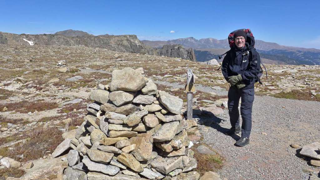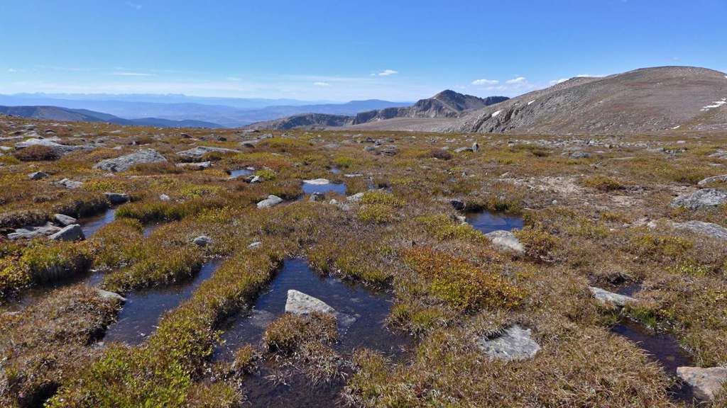 Unser Weg mündet nun in die sanft gewellten Hochflächen der alpinen Tundra an der kontinentalen Wasserscheide. Der steinige Trail wird von großen Steinmännern gesäumt, die die Orientierung bei schlechter Sicht erleichtern sollen. Uns machte hingegen bei bester Fernsicht ein eiskalter Höhensturm zu schaffen, dessen Böen uns immer wieder aus dem Gleichgewicht brachten und uns den Atem nahmen. Trotz der technisch wenig anspruchsvollen Trails darf man die Anforderungen in dieser Hochgebirgswelt bei widrigen Bedingungen nicht unterschätzen. In leichtem Anstieg kommt man zum Wegedreieck westlich des Flattop Mountain (5), 3720 m. Von hier sollte man noch einen Abstecher zum flachen Gipfel des Flattop Mountain (6), 3757 m, machen, der nach wenigen Minuten erreicht ist. Von den Rändern des Gipfelplateaus hat man herrliche Ausblicke auf die Seen am Osthang der Frontrange, zum Longs Peak (mit 4346 m der höchste Berg im Rocky Mountain National Park) und auf die Reste des Tyndall Glacier.