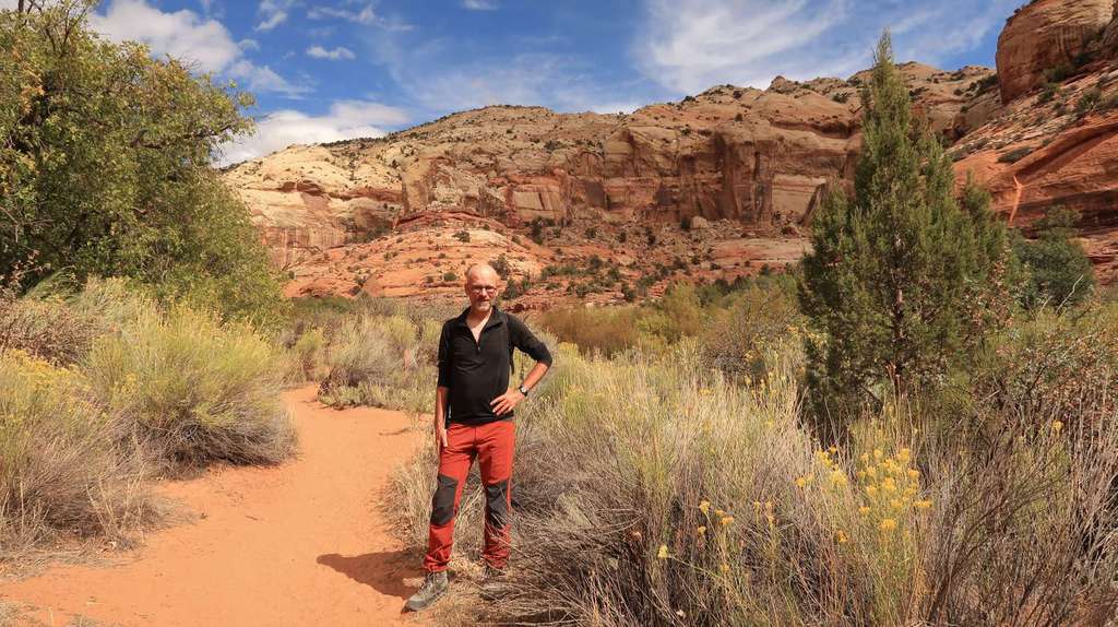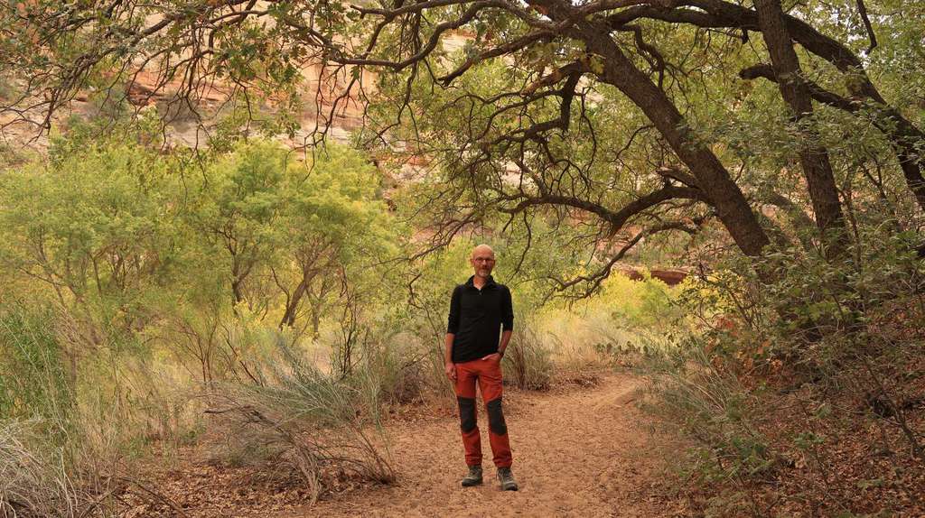 Der Trail ist nun gut ausgebaut, an einigen Stellen aber auch mit Felsstufen durchsetzt und in einigen Abschnitten auch recht sandig. Er führt nun in der weiten Schlucht mit ockerfarbenen Sandsteinfelsen zumeist abseits des Baches aufwärts. Es geht durch trockenes Buschland und gelegentlich durch Wäldchen von Kiefern, Wacholder und Gambel-Eiche.