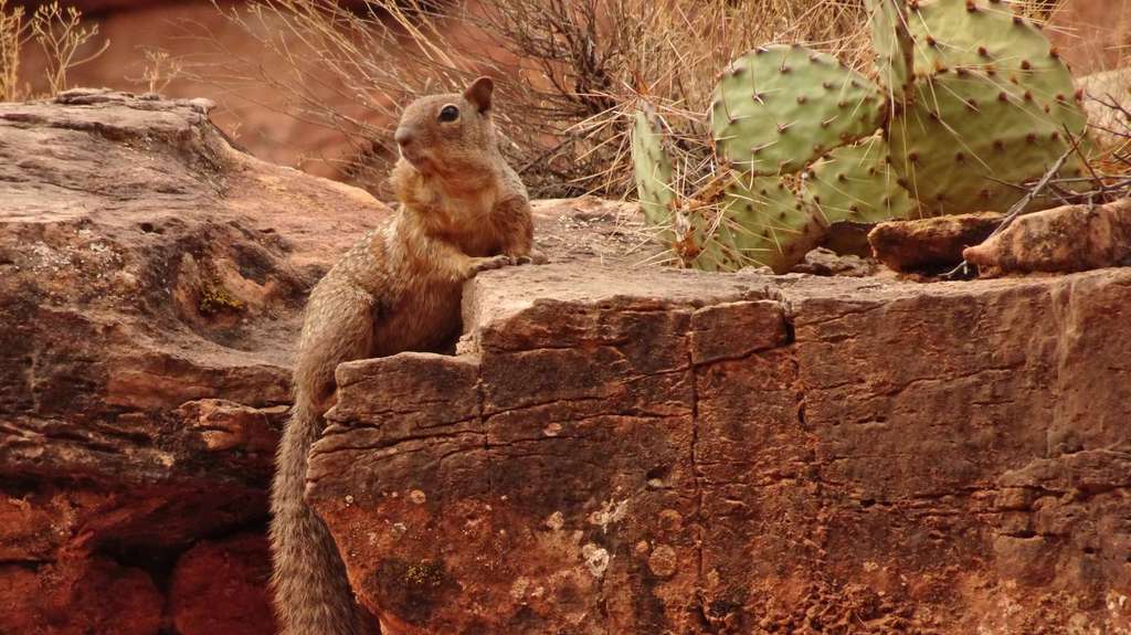 Direkt am Parkplatz mit Sanitäranlagen und Informationstafeln befindet sich ein schattiger Picknickplatz. In seiner Nähe sollte man nach den großen Felsenhörnchen Ausschau halten, die hier häufig nach Essbarem suchen. Dann folgt man der Asphaltstraße noch etwa 250 m nach Norden durch den Campingplatz, bis sie in einer Rechtskurve zum Bach hinab führt. In dieser Kurve beginnt der ausgeschilderte Trail (1), 1640 m. Man sollte sich in das ausliegende Besucherregister eintragen und das ausliegende Faltblatt für die 15 Informationspunkte des Lehrpfades mitnehmen. So erfährt man kurzweilige Hintergründe zur Geologie und Vegetation.