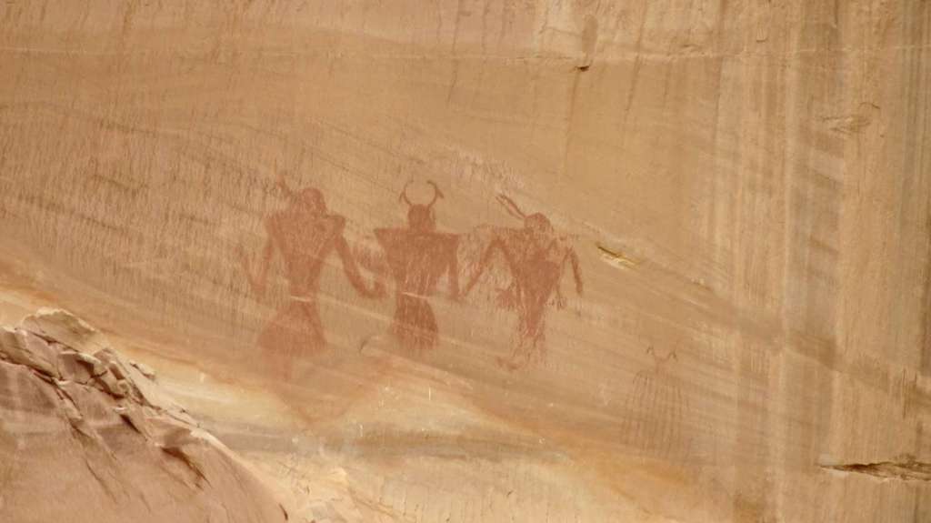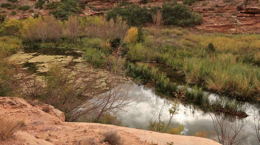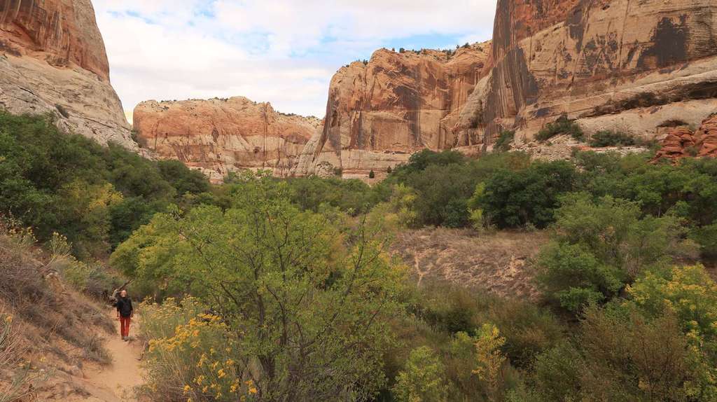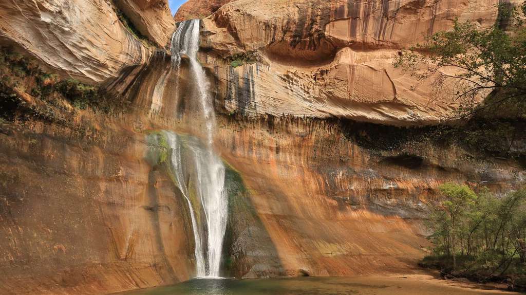 Etwa nach der Hälfte des Hinwegs weist uns einer der Informationspunkte auf die großen indianischen Malereien auf einer glatten Felswand am östlichen Rand des Canyons hin (2), 1680 m. Anschließend quert der Weg das Bett eines von links einmündenden Seitentals und steigt zu einer Geländestufe auf, von der man auf große von Bibern angelegte Teiche hinabblickt. Dann schwenkt die Schlucht nach Norden und verengt sich. Der Trail führt zum klaren Bach hinab, in dem erstaunlich große Forellen schwimmen. Die Vegetation wird üppiger und wir gehen zumeist im Schatten der Bäume auf unser Ziel zu, das wir bald schon hören können. Der sehr ästhetische Wasserschleier der Calf Creek Falls (3), 1720 m, stürzt in einem halbrunden Felskessel über eine fast 40 m hohe Stufe aus rötlichem Sandstein in ein großes Becken. Man kann sich im kühlen Wasser erfrischen oder einfach nur im Schatten von Wasserbirken sitzen und den herrlichen Anblick genießen, bevor man sich auf den Rückweg macht.