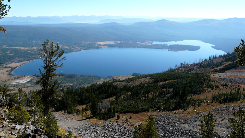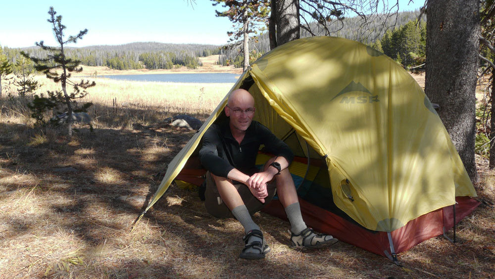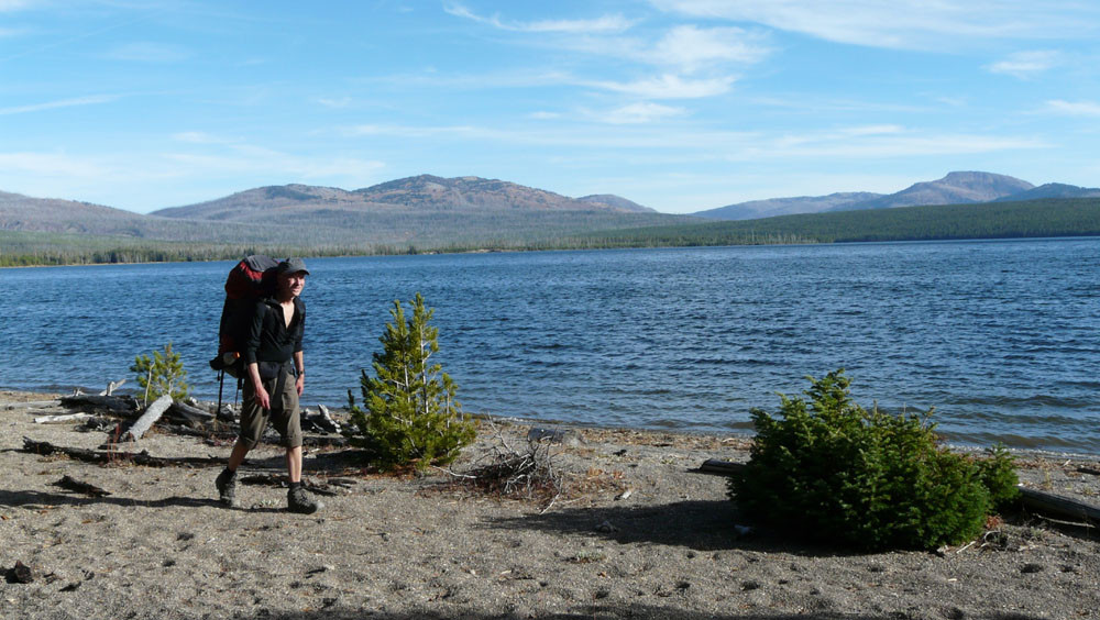 Wir starten in der Frühe noch ohne großes Gepäck zur Besteigung des Mount Sheridan. Zunächst machen wir einen Abstecher vom Weg zu den heißen Quellen an seinem Fuß. Überall dampft es in der kalten Morgenluft und unvermittelt bricht ein kleiner Geysir aus. Dann steigen wir zügig den Weg zum Berg hinauf. Auf einem Sattel genießen wir weite Blicke zum Grand Teton, über Teile des Yellowstone Lake und hinab zum Heart Lake. Die letzten etwa 200 Höhenmeter zum Gipfel schenken wir uns und steigen auf dem selben Weg wieder ab. Zurück am Lagerplatz gibt es ein spätes Frühstück, bevor wir über dem Westufer des Sees in südlicher Richtung marschieren. Wir passieren den Sheridan Lake und kommen später zu Biberdämmen, die den Bach aufgestaut haben und uns mehrmals dazu zwingen, die Schuhe auszuziehen und durch das Wasser und den Schlamm zu waten (Trekkingsandalen sind hier von Nutzen!). In einem Waldstück finden wir schließlich den kleinen Wegweiser zu unserem Lager (8B5). Nach dem Abendessen, sichern wir wieder den Proviant. Den Benzinkocher hängen wir in einer Plastiktüte an einen Ast. Dann kriechen wir ins Zelt und verbringen etwa 20 m von der Kochstelle entfernt eine ruhige Nacht.