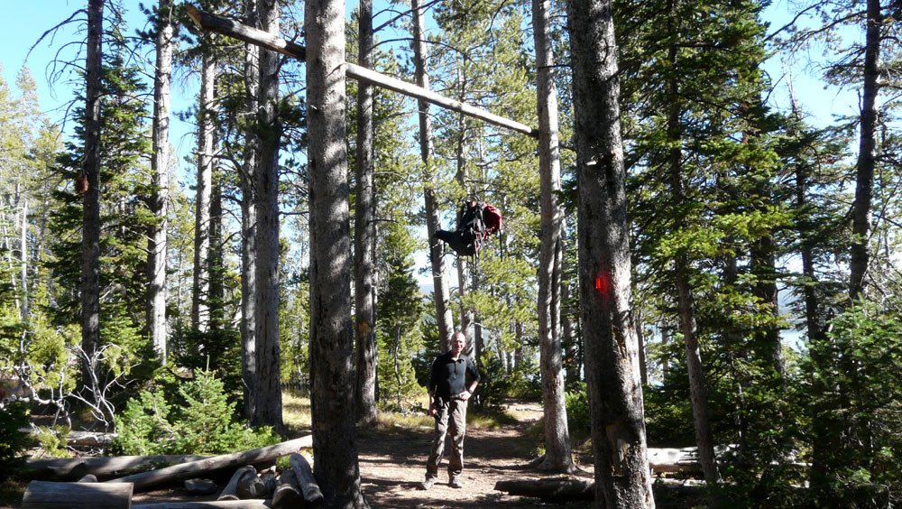 Nach dem wir in der Ranger Station von Grant Village unser Permit bekommen haben, fahren wir zum Heart Lake Trailhead (nahe Lewis Lake). Dort lassen wir unser Auto während der Tour stehen und starten gegen Mittag zur ersten, kurzen Etappe. Es geht durch ein Waldgebiet, das einige Spuren von Waldbränden trägt. Nach gut zwei Stunden stehen wir auf einer Kuppe, von der wir den ersten Blick auf den Heart Lake haben. Auf der Anhöhe kann man auch einige kleinere Thermalerscheinungen erkunden. Nun windet sich der Weg hinab zum nur langsam näher kommenden See. An dessen Ufer gehen wir nach Westen zum Fuß des Mount Sheridan, wo wir unseren Zeltplatz (8H4) finden. Wir müssen uns mit der neuen Methode, Esswaren vor Bären in Sicherheit zu bringen, vertraut machen. Ein mitgebrachtes Seil (mindestens 10 m; nicht vergessen!) wird über einen hoch zwischen zwei Bäumen quer angebrachten Baumstamm geworfen und alles, was bärensicher sein muss, daran hochgezogen. Wie wichtig das ist, sollte uns in der nächsten Nacht bewusst werden.