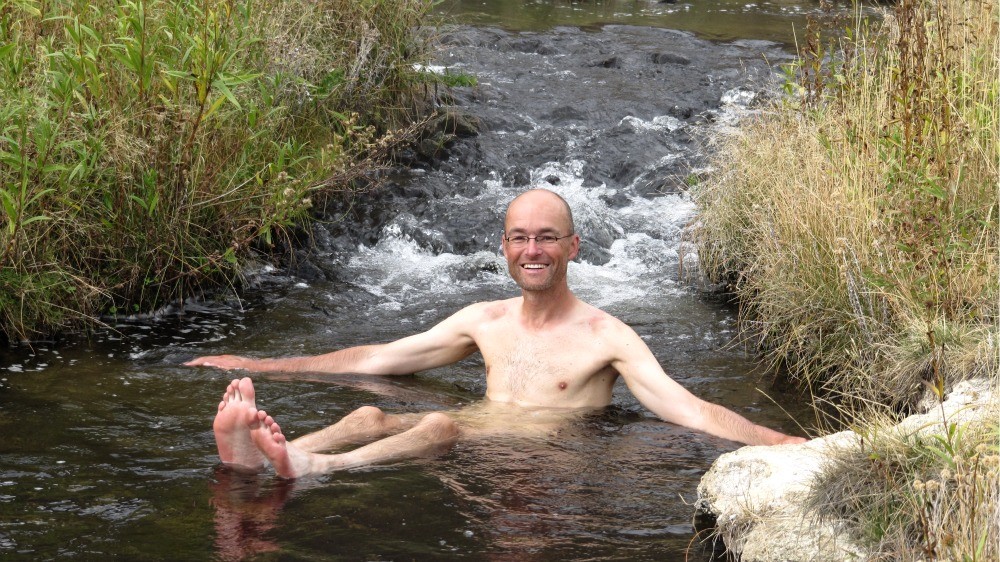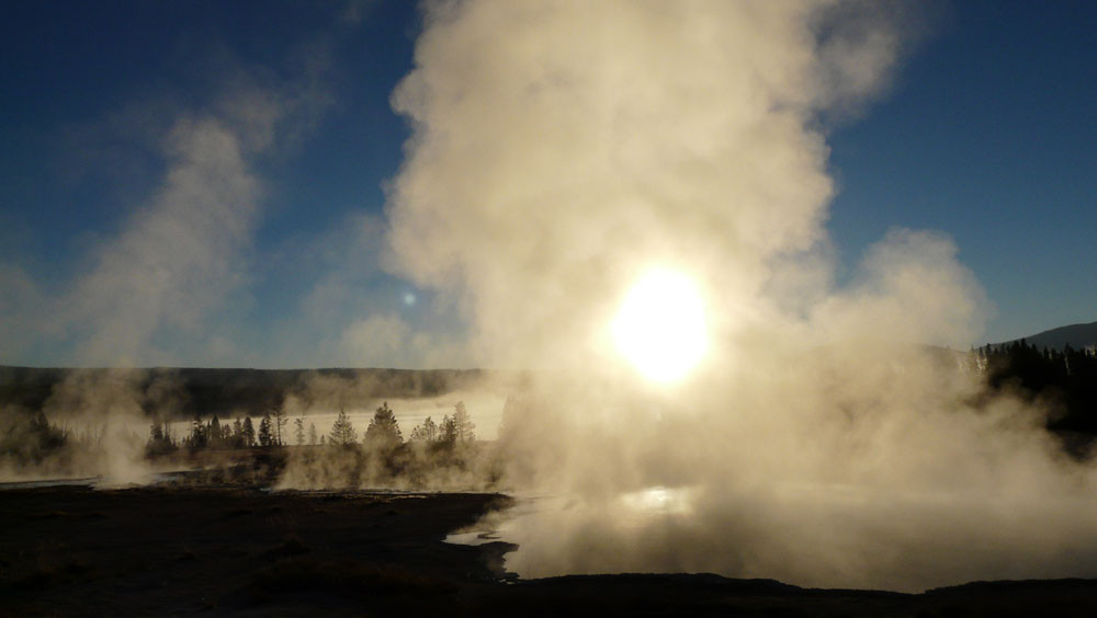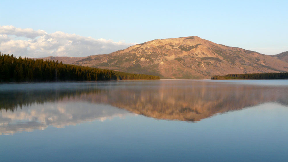 Schön leuchtet der Mount Sheridan am nächsten Morgen in den ersten Sonnenstrahlen über dem See. Abseits des Ufers wandern wir durch bewaldete Hügel auf dem Heart Lake Trail zum Nordufer des Sees, wo wir an der Ranger Station wieder auf den bekannten Weg zum Ausgangspunkt treffen. Als wir an heißen Quellen vorbeikommen und sich die Temperatur im nahen Bach als sehr angenehm herausstellt, beschließen wir noch ein Wellness-Bad in freier Natur zu nehmen. Wieder auf dem Weg, ziehen dunkle Wolken heran und in dem Moment, als wir das Auto erreichen, beginnt es nach einer Woche voller Sonnenschein zu regnen.