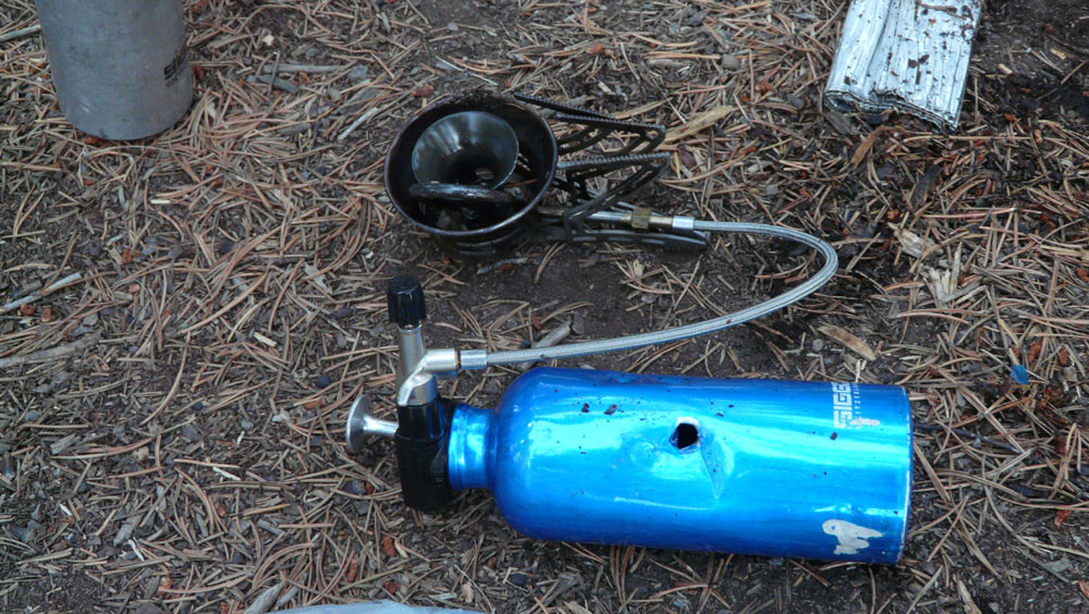 Als ich am Morgen nach dem rechten sehe, liegt die Plastiktüte zerfetzt auf dem Waldboden, die daranhängende Metallflasche trägt deutliche Bissspuren und ist ausgelaufen. Mehrere Plastikwasserflaschen sind kaputtgebissen. Hier hat ein vom Benzingeruch anglockter Bär sein Unwesen getrieben. Damit hatten wir nicht gerechnet. Zum Glück ist die Reserveflasche unversehrt, denn ohne Brennstoff hätten wir die Tour schon früh abbrechen müssen.