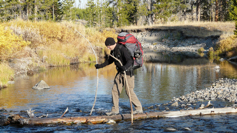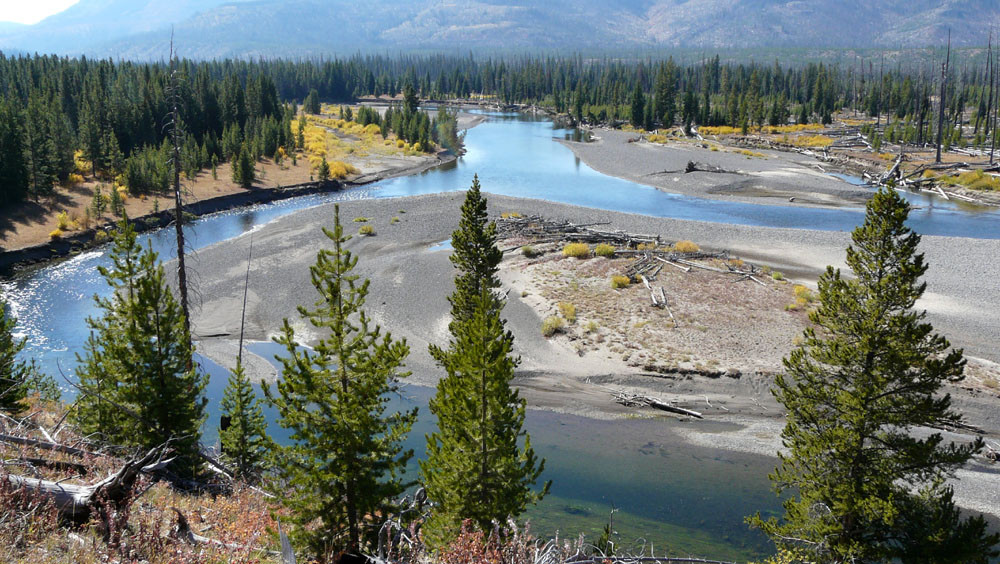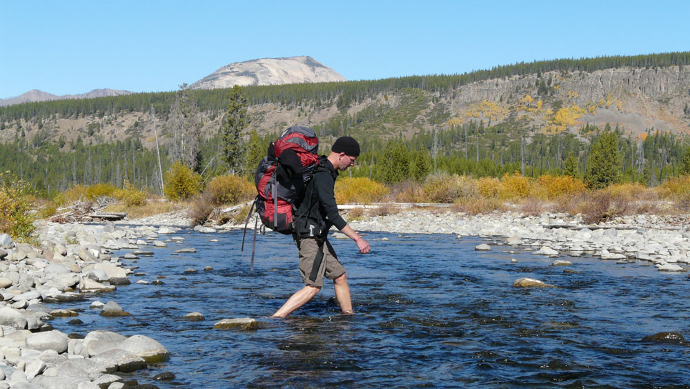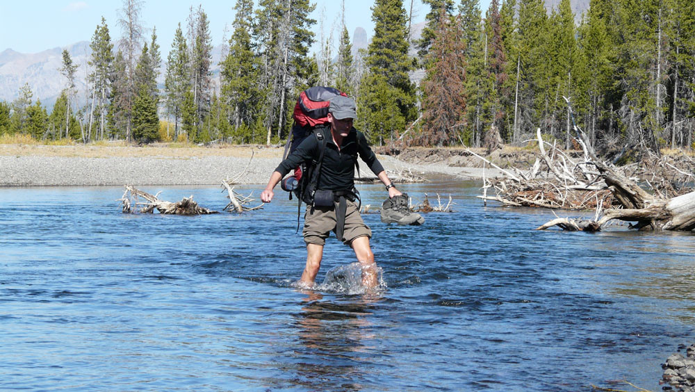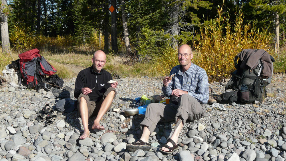 Kurze Zeit nach diesen Begegnungen holen wir an einem kleinen Bach das verschobene Frühstück nach. Dann geht es weitgehend eben weiter am Rande des Flusstales, bis ein Pfad abzweigt und die Böschung zum Fluss hinabführt. Eine orange Markierung am anderen Ufer gibt das Ziel an. Wir müssen wieder durch den Yellowstone River, doch dieses Mal ist das Wasser tiefer als erwartet, so dass die hochgekrempelten Hosen bis zum Schritt nass werden. Aber in der Herbstsonne trocknet alles rasch wieder. Vorbei an schönen Altarmen durchqueren wir das Flusstal und stoßen am Nachmittag an das Südufer des Yellowstone Lake. Unser Zeltplatz 6A4 liegt direkt hinter dem endlosen Sandstrand.