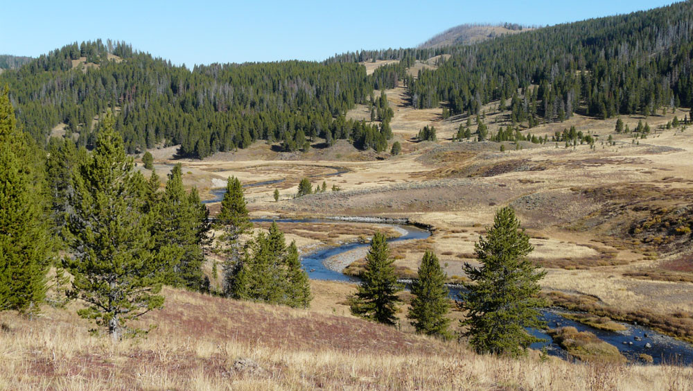 Wir folgen nun dem Weg über das Two Ocean Plateau, überqueren die kaum merkliche kontinentale Wasserscheide und steigen entlang des Lynx Creek in das weite Tal des oberen Yellowstone River hinab. Wir überqueren den Fluss an einer Furt und gehen dann durch das ebene Grasland zum Westrand des Tals, wo wir auf den Thorofare Trail treffen. Auf ihm geht es nach Norden am Fuß der Berge, die den Yellowstone Nationalpark in Osten begrenzen. Mehrfach stoßen wir auf die ausgeprägten Schleifen des Flusses, der sich durch die Ebene schlängelt, bis wir an unserem Etappenziel 6Y6 ankommen. Wir sind etwas enttäuscht, denn hier im Tal hatten wir Bisons und Hirsche erwartet, doch im Sand des Flussufers finden wir nur die deutlichen Spuren von Elch und Bär. In der Nacht hören wir die Tritte und das Schnaufen einens großen Tieres in der Nähe des Zeltes. Wer diese Geräusche macht, können wir nicht genau herausbekommen.