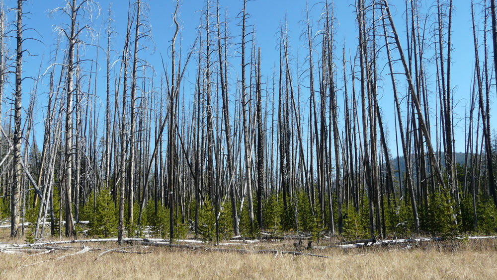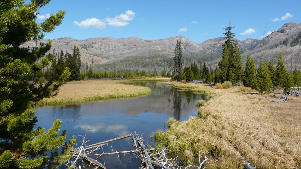 Es geht nun weiter bis zum Snake River Trail, auf den wir einbiegen. Zwei Mal queren wir den seichten Flusslauf. Dann stoßen wir auf den Continental Divide Tail, dem wir nach Süden in das Tal des Snake River folgen. Das Tal verengt sich langsam zu einer Schlucht und der Trail steigt in den Hang hinauf. Leider sind weite Bereiche der Wälder hier den großen Feuern von 1988 zum Opfer gefallen. Bis sich die Vegetation regeneriert hat, werden noch viele Jahrzehnte vergehen. Unser Campingplatz 8C9 liegt idyllisch an einem Zulauf des Snake River. Wir können gar nicht weit entfernt die Brunftrufe von Wapiti-Hirschen hören, zu sehen bekommen wir sie nicht.