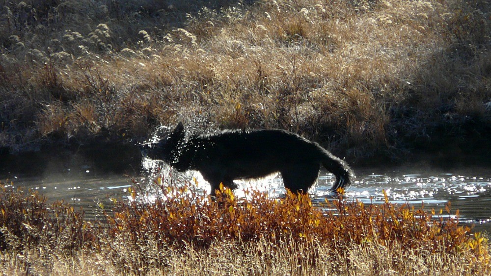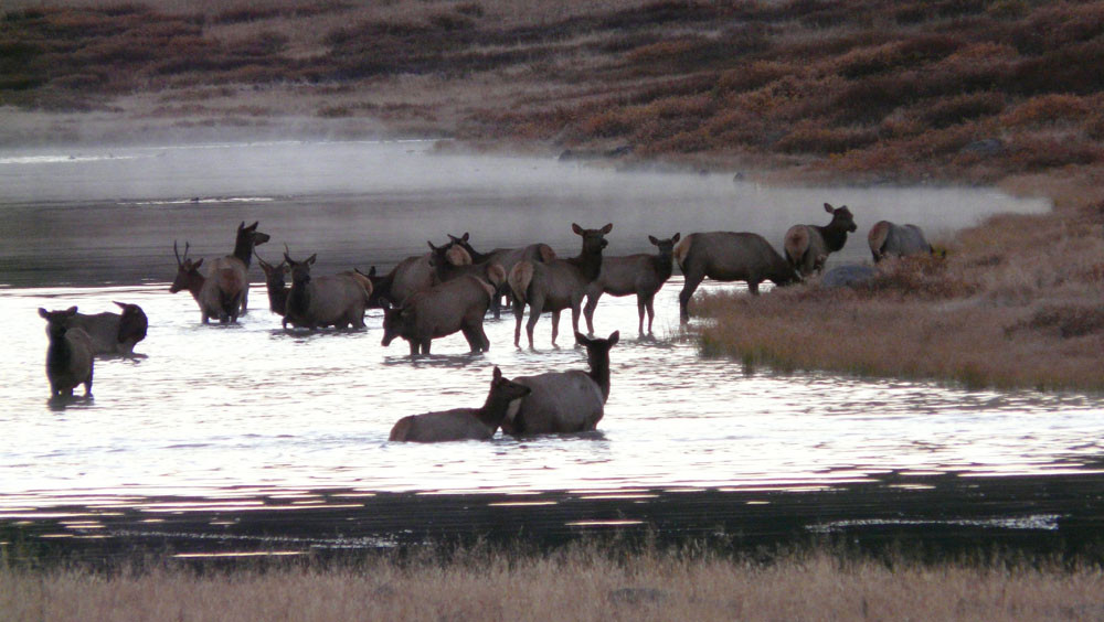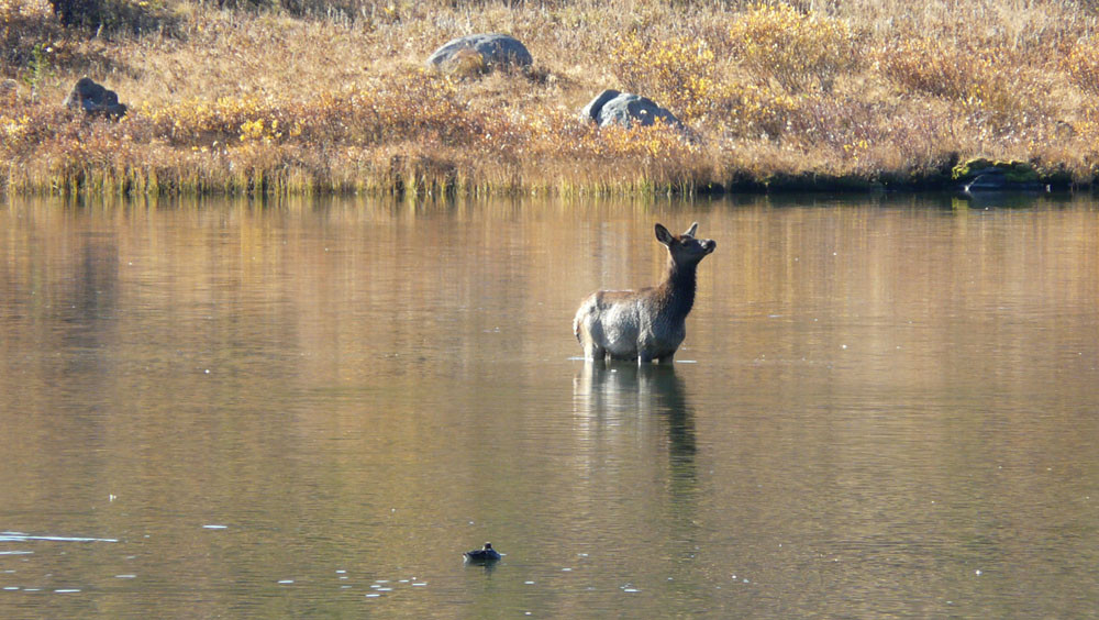 Im Morgengrauen werden wir vom nahen Getrampel zahlreicher Hufe geweckt. Eine Herde Wapiti-Hirsche zieht zum Ufer des Sees zur Tränke. Bald verschwinden sie wieder im Wald und eine Weile kehrt Ruhe ein. Plötzlich steht ein Wolf unweit des Zeltplatzes im Auslauf des Sees und schüttelt sich das Wasser aus dem Fell. Seine Aufmerksamkeit gilt einem Maultierhirsch am fernen Seeufer. Eine wilde Hetzjagd beginnt und Jäger und Beute verschwinden im Wald. Bald taucht der Hirsch in panischer Flucht wieder auf, springt in den See, schwimmt zu einer seichten Stelle, wo er noch lange Zeit ausharrt. Der Wolf erscheint erneut am Ufer, gibt die Jagd aber auf. Was für ein Erlebnis!