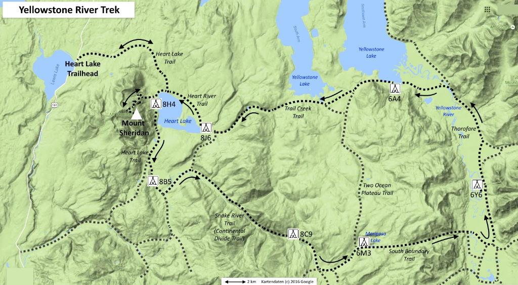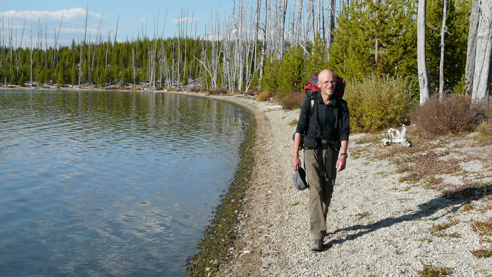 Wir haben lange nach einer geeigneten, etwa einwöchigen Tour im Yellowstone National Park gesucht, die als Rundtour zum Ausgangspunkt zurückführt. In der einsamen Südostecke sind wir fündig geworden. Die relativ sanfte Landschaft hier steht in starkem Kontrast zur Trekkingtour im Grand Teton Nationalpark und ist daher eine gute Ergänzung. Einziger echter Gipfel der Tour ist der Mount Sheridan hoch über dem Heart Lake, dessen Besteigung wegen der weiten Aussicht lohnt. Weitere Höhepunkte sind die heißen Quellen am Heart Lake, die großen (Heart und Yellowstone Lake) und kleinen (Mariposa Lake) Seen sowie das weite Tal des oberen Yellowstone Rivers. Unvergesslich sind die intensiven Begegnungen mit Wolf, Bär, Elch, Hirsch und Bison. Die Gegend ist jenseits des Heart Lakes relativ wenig begangen. Eine Woche lang haben wir dort Ende September / Anfang Oktober keinen Menschen getroffen. Die Trails sind durchwegs gut zu verfolgen und unschwierig, doch müssen mehrfach Flüsse und Bäche durchquert werden.