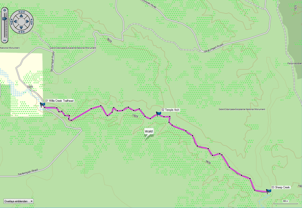 Vom Parkplatz (1), 1830 m, aus queren wir die Straße und wandern auf schmalem Pfad links oberhalb des Baches entlang, bis der Wegverlauf uns in den noch sehr flachen Einschnitt des Willis Creek hinabführt. Nun geht es auf Kieseln neben dem in der Regel nur spärlichen Wasserlauf weiter stromabwärts. Nach ca. 800 m müssen wir einem kleinen Wasserfall auf einem Trampelpfad rechts des Baches umgehen. Von nun an bleiben wir immer im Bachbett, ein Verlaufen ist nicht möglich. Allmählich werden die Felswände neben uns immer gewaltiger und das Naturerlebnis steigert sich stetig. Die eindrucksvollsten Engstellen erstrecken sich etwa 1,5 km nach dem Start. Danach weitet sich die Schlucht plötzlich. Links oben in der Schluchtwand können wir den Felsbogen des Temple Arch (2), 1805 m, erkennen. Wenig später mündet von links der Averett Canyon ein. Der Haupt-Canyon macht eine Rechtsbiegung und wir laufen um breiten Kies- und Sandbett durch die weiterhin sehr reizvolle Schlucht, in der nun große Bäume und Büsche neue Akzente setzen. Nach insgesamt 3,8 km, für die wir aufgrund der spannenden Wegstrecke 1,5 Stunden einplanen sollten, erreichen wir die Einmündung in den Sheep Creek (3), 1780 m. Vor uns erhebt sich eine Felswand mit auffälligen Aushöhlungen im oberen Drittel. Hier heißt es nun umzukehren und auf demselben Weg zum Trailhead zurückzukehren.