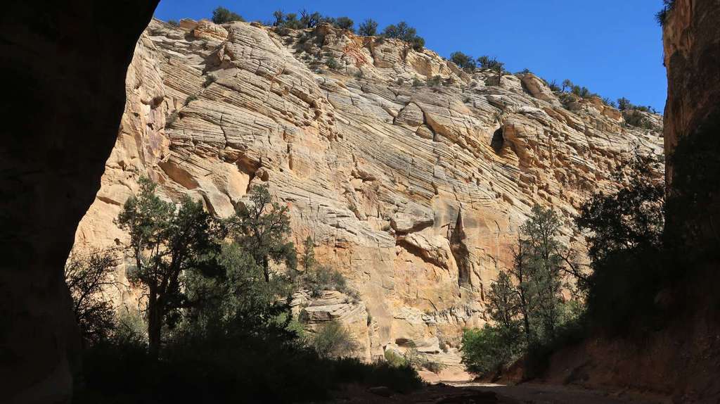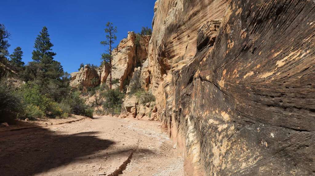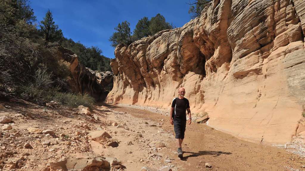 Vom Parkplatz (1), 1830 m, aus queren wir die Straße und wandern auf schmalem Pfad links oberhalb des Baches entlang, bis der Wegverlauf uns in den noch sehr flachen Einschnitt des Willis Creek hinabführt. Nun geht es auf Kieseln neben dem in der Regel nur spärlichen Wasserlauf weiter stromabwärts. Nach ca. 800 m müssen wir einem kleinen Wasserfall auf einem Trampelpfad rechts des Baches umgehen. Von nun an bleiben wir immer im Bachbett, ein Verlaufen ist nicht möglich. Allmählich werden die Felswände neben uns immer gewaltiger und das Naturerlebnis steigert sich stetig. Die eindrucksvollsten Engstellen erstrecken sich etwa 1,5 km nach dem Start. Danach weitet sich die Schlucht plötzlich. Links oben in der Schluchtwand können wir den Felsbogen des Temple Arch (2), 1805 m, erkennen. Wenig später mündet von links der Averett Canyon ein. Der Haupt-Canyon macht eine Rechtsbiegung und wir laufen um breiten Kies- und Sandbett durch die weiterhin sehr reizvolle Schlucht, in der nun große Bäume und Büsche neue Akzente setzen. Nach insgesamt 3,8 km, für die wir aufgrund der spannenden Wegstrecke 1,5 Stunden einplanen sollten, erreichen wir die Einmündung in den Sheep Creek (3), 1780 m. Vor uns erhebt sich eine Felswand mit auffälligen Aushöhlungen im oberen Drittel. Hier heißt es nun umzukehren und auf demselben Weg zum Trailhead zurückzukehren.