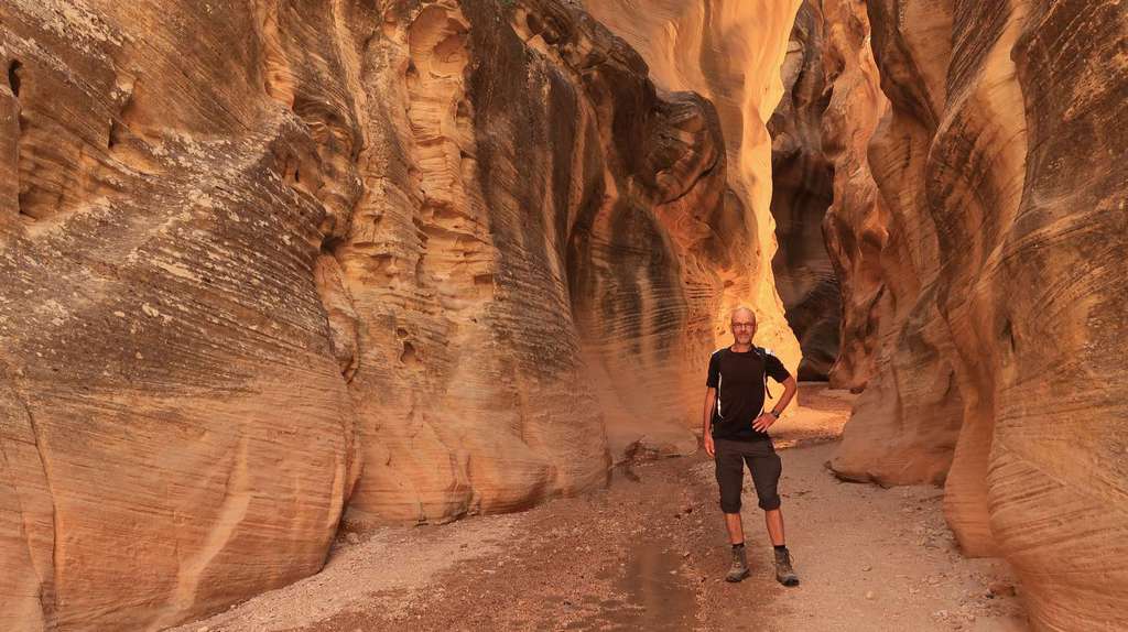 Und auch die Naturfotografen kommen voll auf ihre Kosten. Zu Beginn ist die Schlucht noch relativ flach und die vom Wasser gestalteten Wände werden direkt von der Sonne beschienen. In den Narrows ist später kaum noch der Himmel zu sehen, doch das rötliche Gestein reflektiert das indirekt einfallende Licht in warmen Tönen. Und selbst der zweite Teil der Wanderung, wenn sich der Canyon nach dem Temple Arch weitet, ist landschaftlich noch sehr reizvoll.